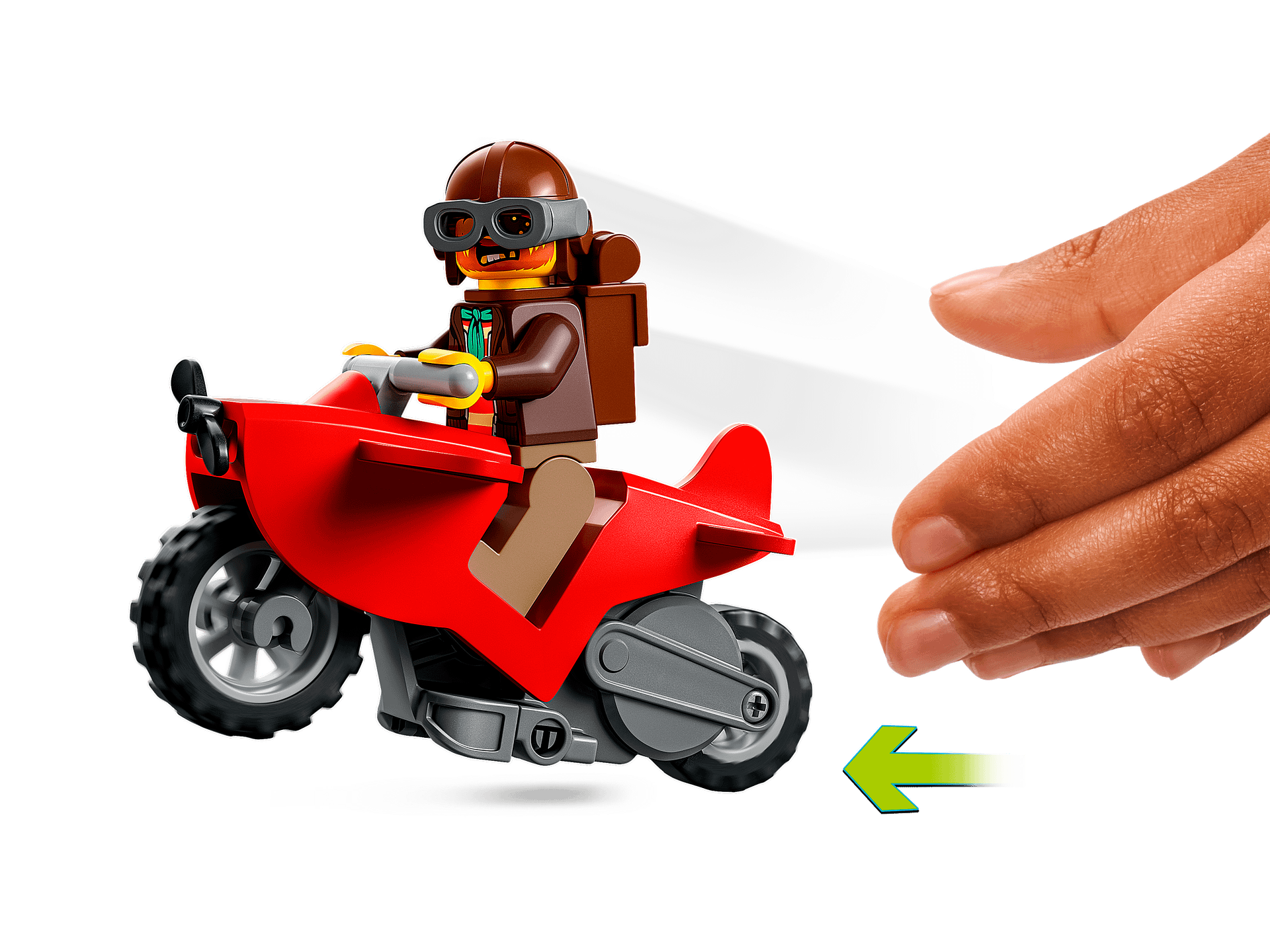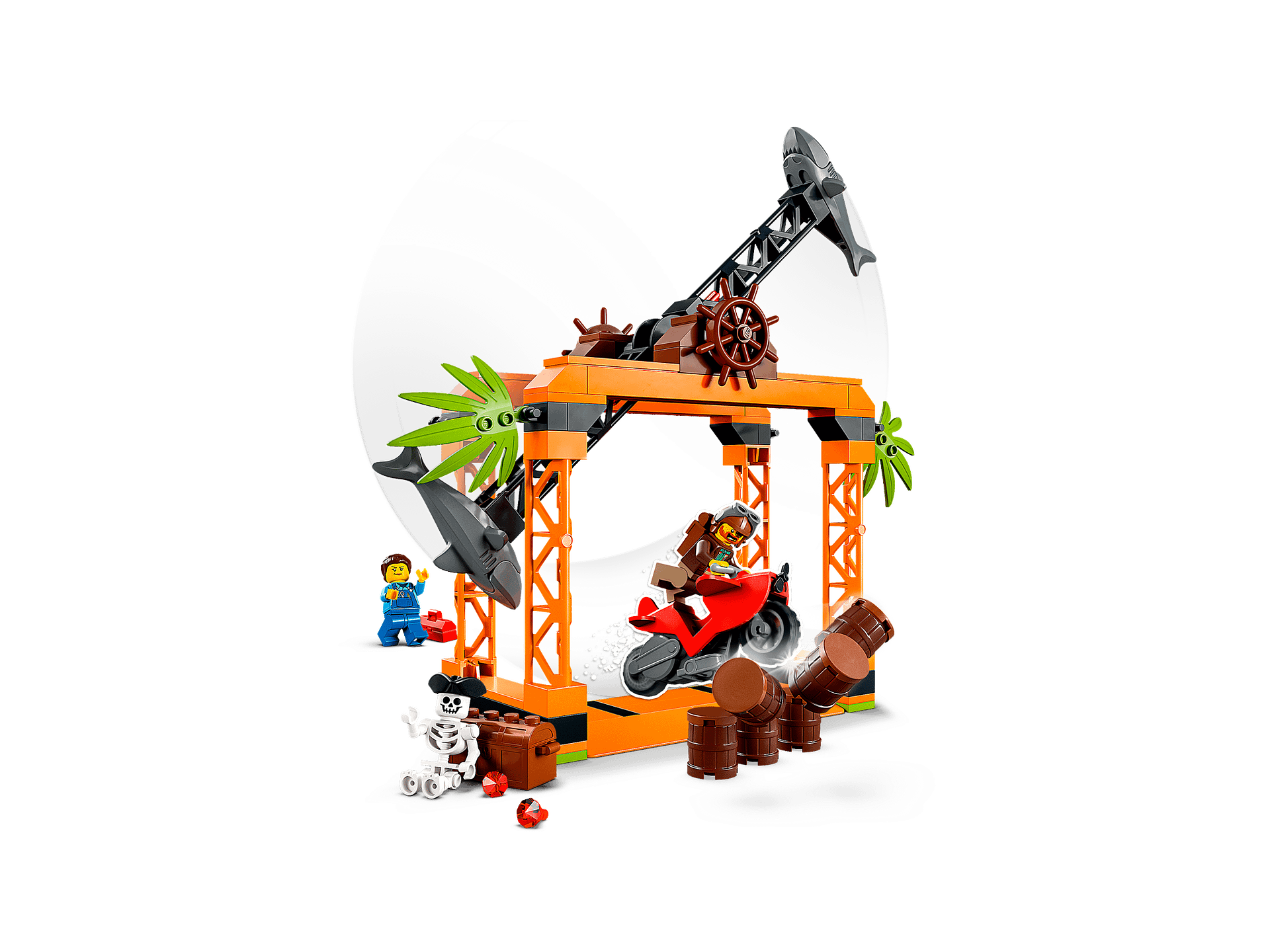 - LEGO® City Stuntz challenge with fun functions – Kids activate the toy stunt bike and release it, avoiding the spinning shark wheel, to strike the barrels and reveal the pirate treasure chest