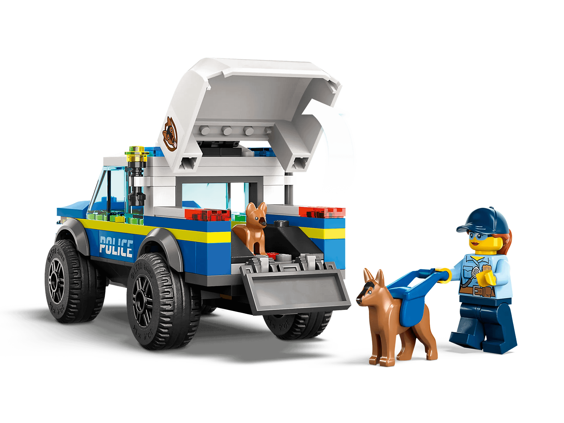 - LEGO® minifigure accessories – This toy police playset comes with a grooming brush, flashlight, shovel and 2 toy dog treats