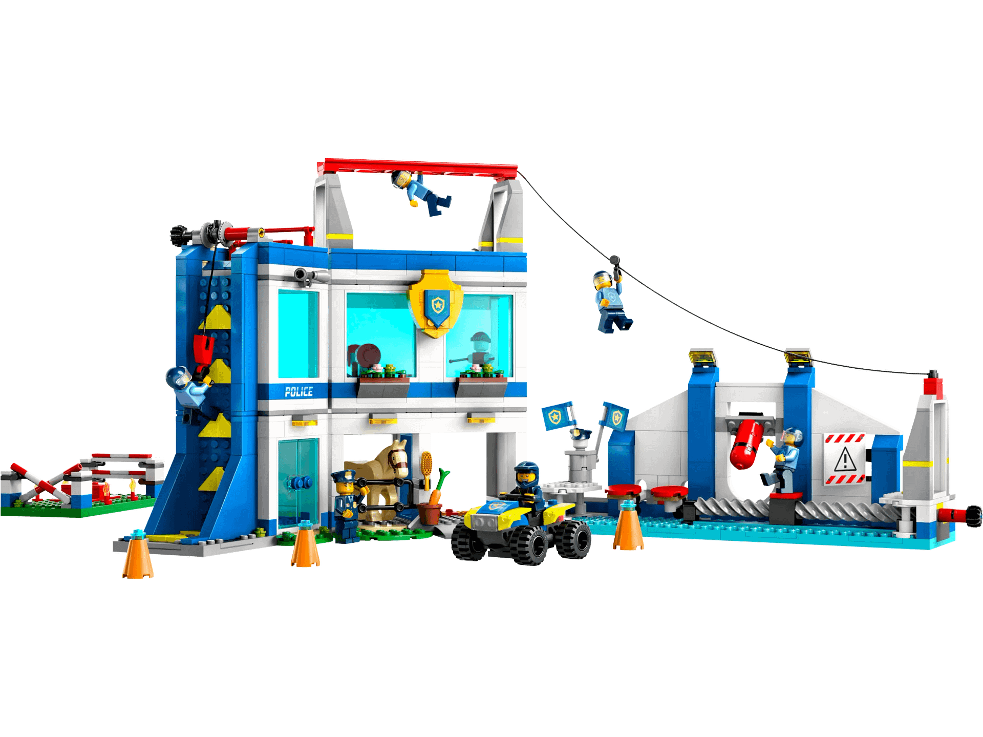 The LEGO® City Police Training Academy (60372) set features a modular multi-room police station and an outdoor obstacle course with fun facilities, including a toy climbing wall, monkey bars and a zip line. It also includes a steerable ATV, 6 minifigures and a horse figure.