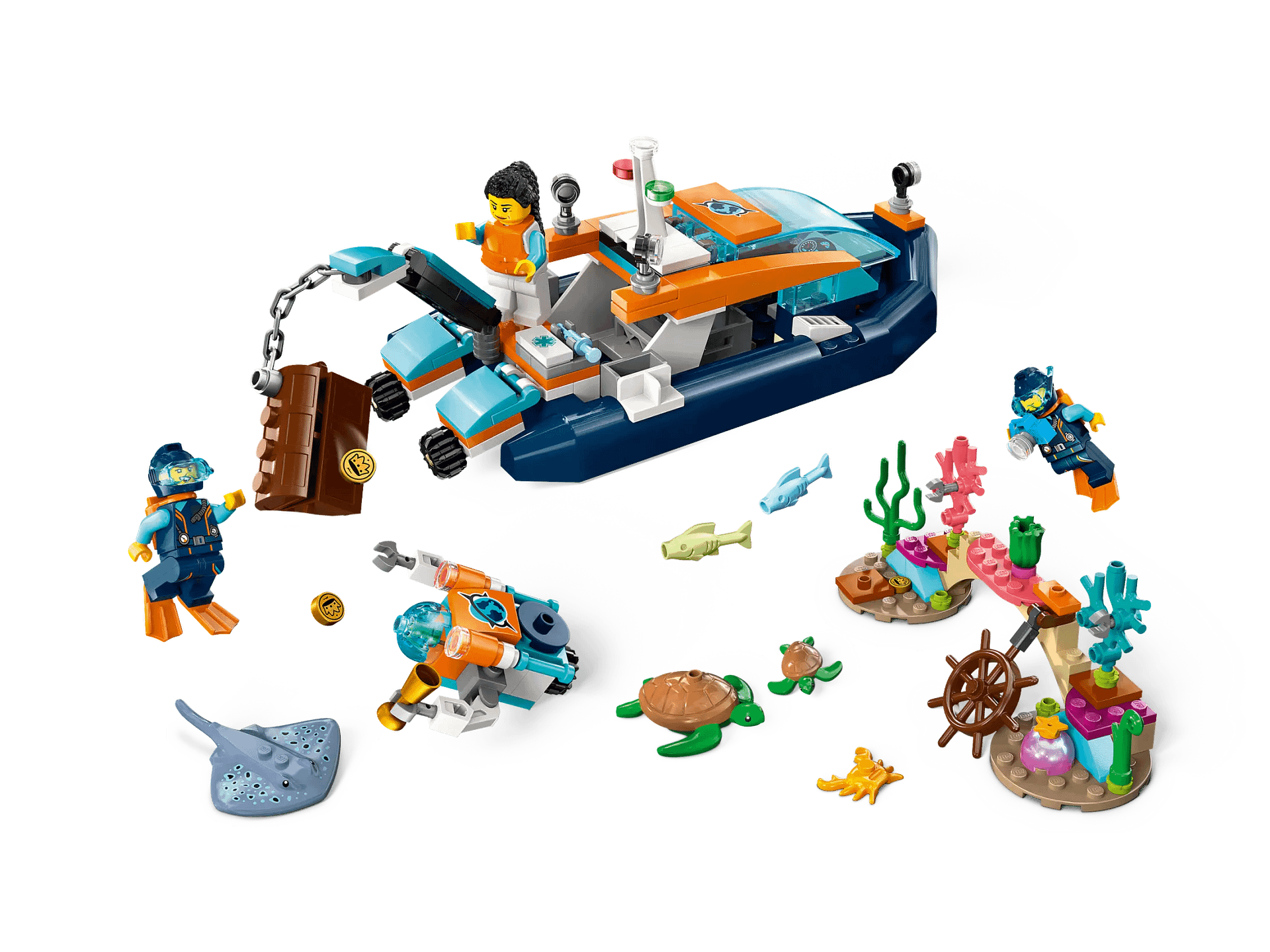 - What’s in the box? – Everything kids need to build a toy inflatable boat, minisub and coral reef setting, plus 3 explorer minifigures and manta ray, hammerhead shark, crab, 2 fish and 2 turtle figures