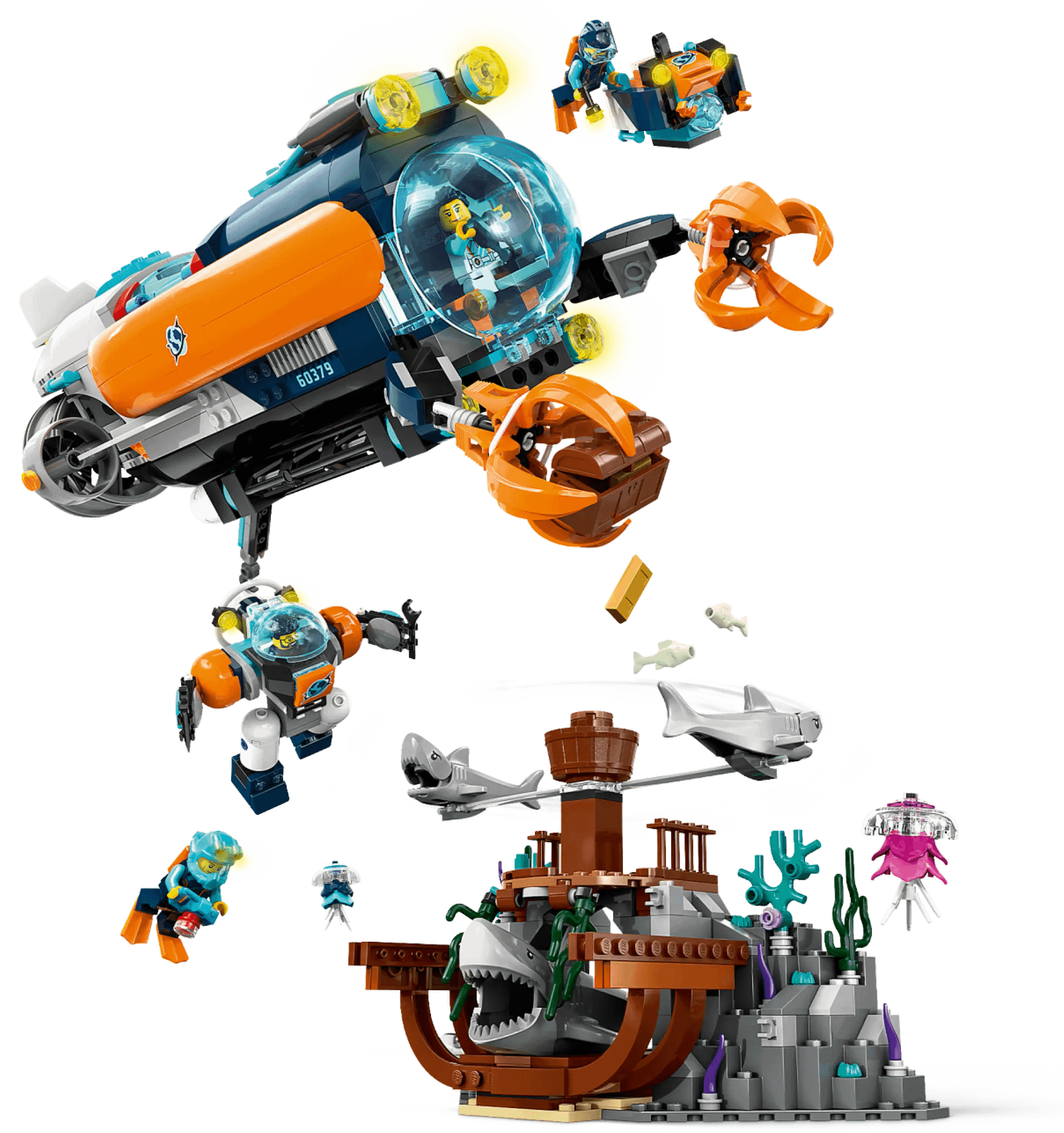 - What's in the box? – All kids need to build a deep-sea submarine, drone, diving suit, shipwreck setting and 6 explorer minifigures, plus 1 skeleton, 3 shark, 2 jellyfish and 4 fish figures