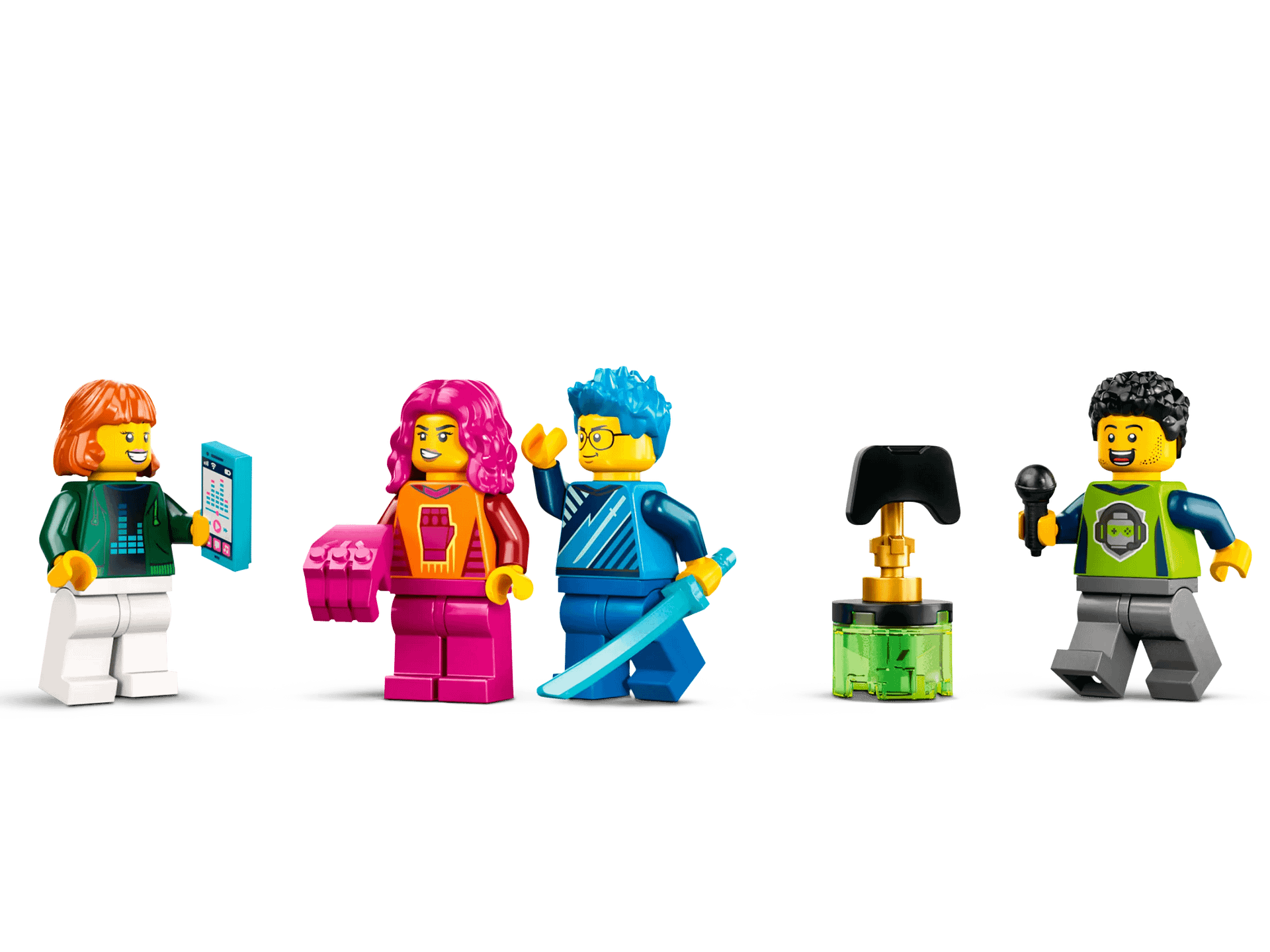 - Minifigure accessories – The LEGO® toy accessories in this set include a winner’s trophy, microphone, mobile phone and gaming items, including big fists and a sword
