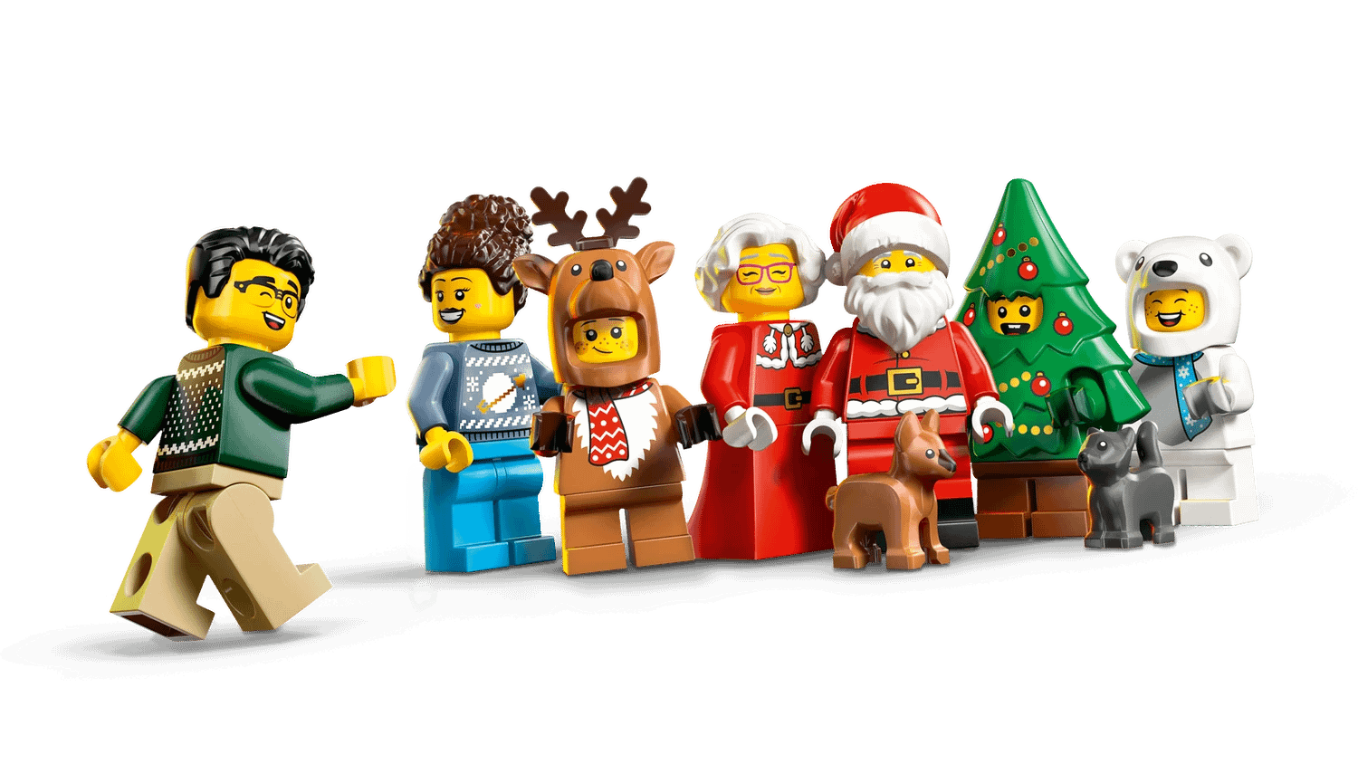 - Advent calendar gift set with 24 surprises – Includes Santa and Mrs. Claus minifigures, characters with polar bear, reindeer and holiday tree costumes, mini builds and fun accessories