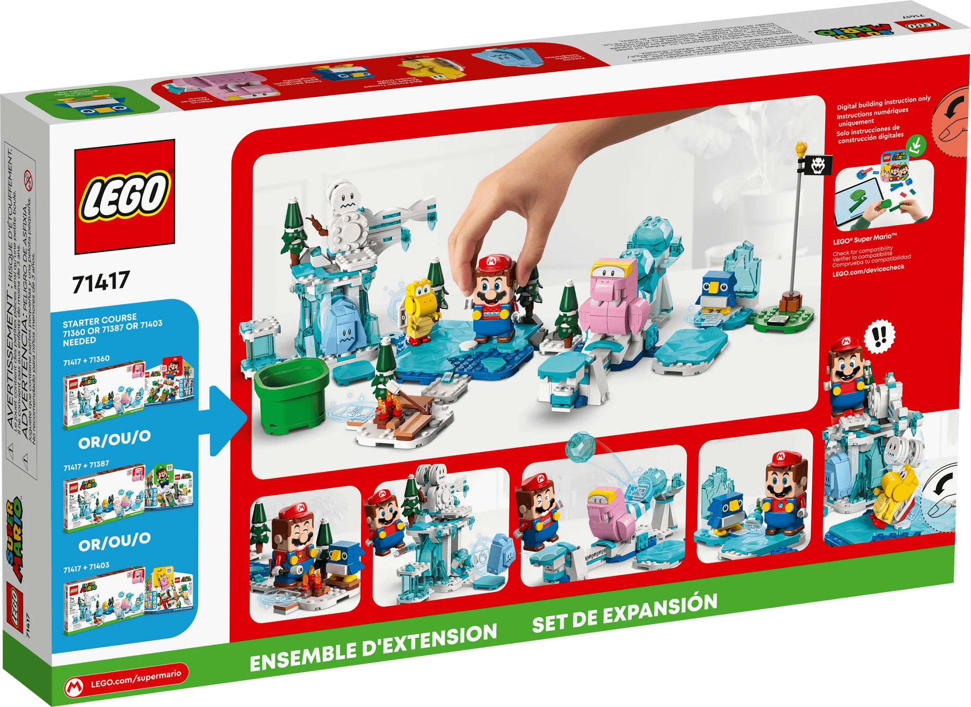- Buildable Fliprus Snow Adventure Expansion Set (71417) – Children can create an action-packed ice level for digital coin-collecting and role-play fun with this LEGO® Super Mario™ Expansion Set