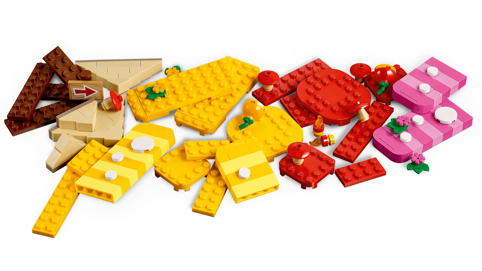 - 3 fruits, a gift box and a Super Mushroom with an Action Tag – Includes a red, yellow and green fruit for LEGO® Mario™, LEGO® Luigi™ or LEGO® Peach™ (figures not included) to ‘eat’