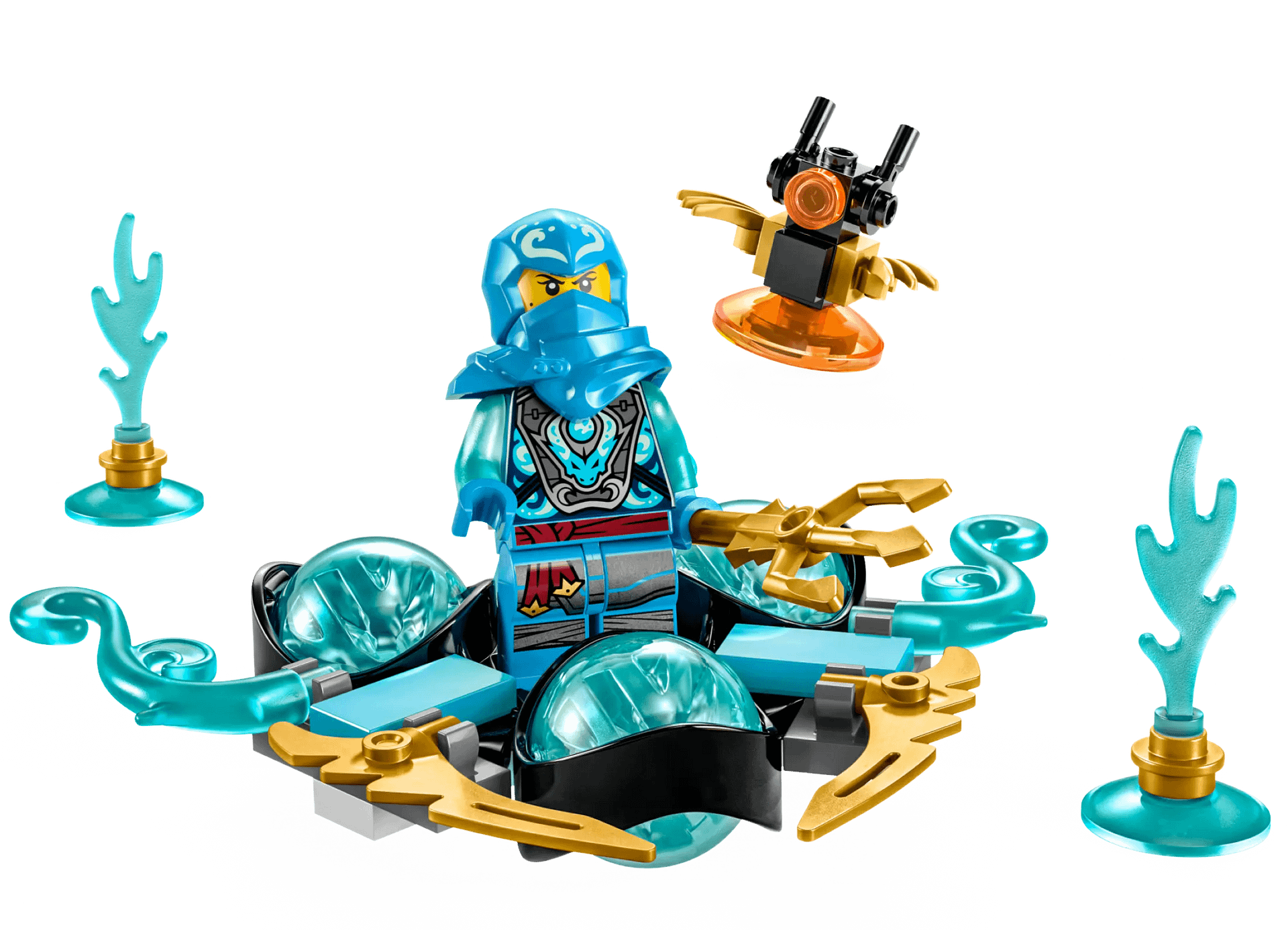 Kids can place Dragon Power Nya in the spinner adorned with 3 exclusive dragon power elements, push forward on itand watch as she drifts. Her task is to avoid the water obstacle elements, conquer the Imperium Droid holding a staff and grab the collectible golden dragon energy core element from its bowl. There is also a blue dragon power element and kids can collect 4 more in different colors in other NINJAGO® sets.