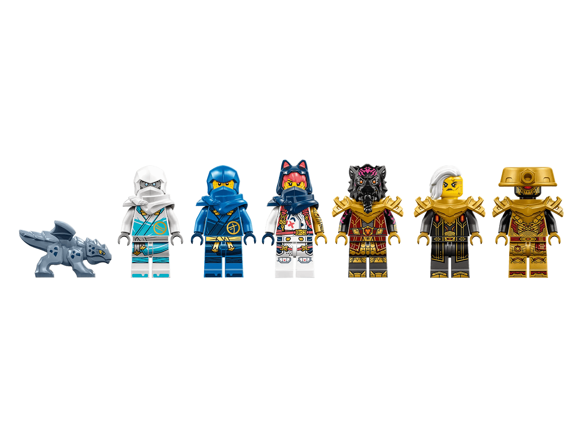 - 6 minifigures – Jay, Sora and Zane, who come with 2 golden katanas each to take on Lord Ras and his hammer, Empress Beatrix with her Imperium sword and an Imperium Guard with a staff
