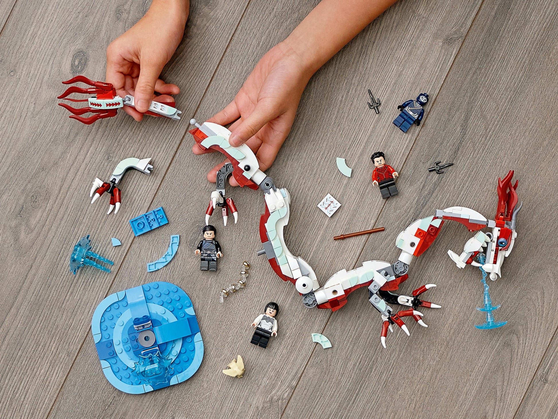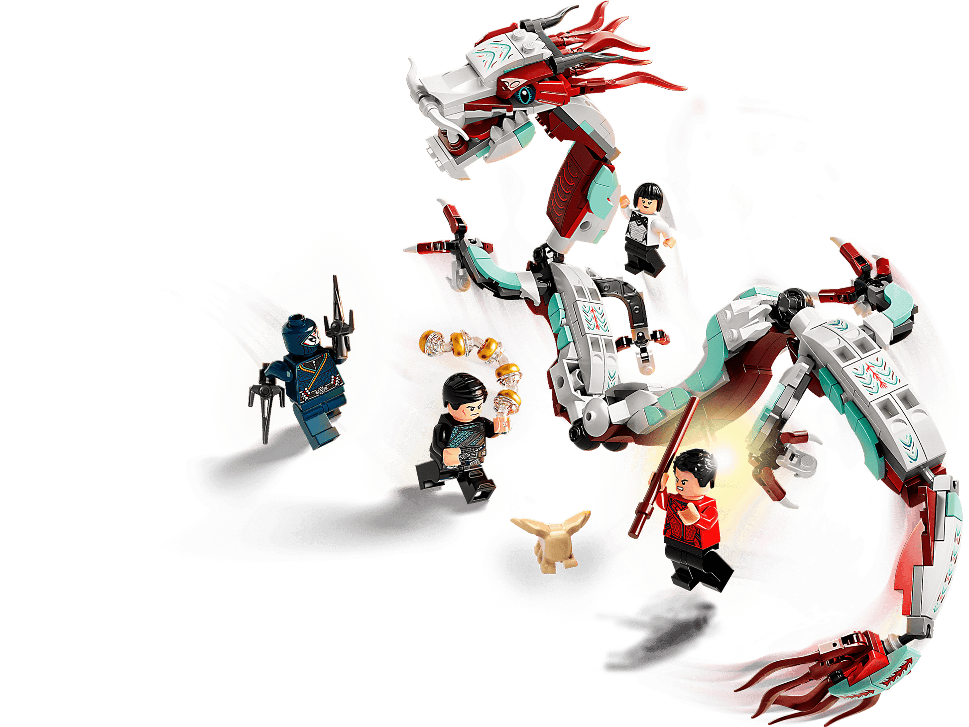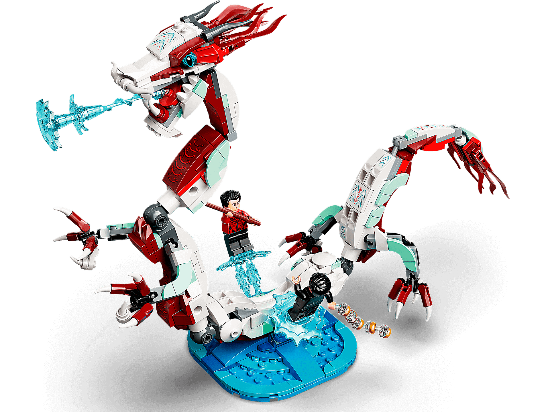 - Includes 4 minifigures – Shang-Chi, Xialing, Wenwu and Death Dealer – and a buildable, articulated dragon with a detachable water base.