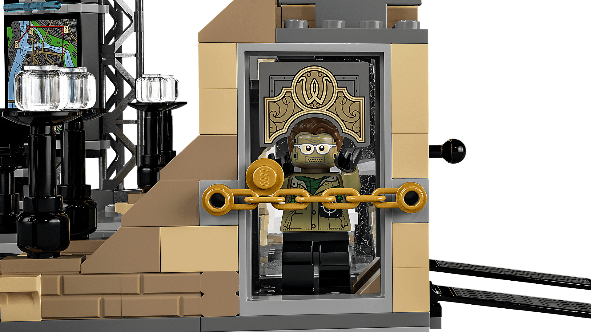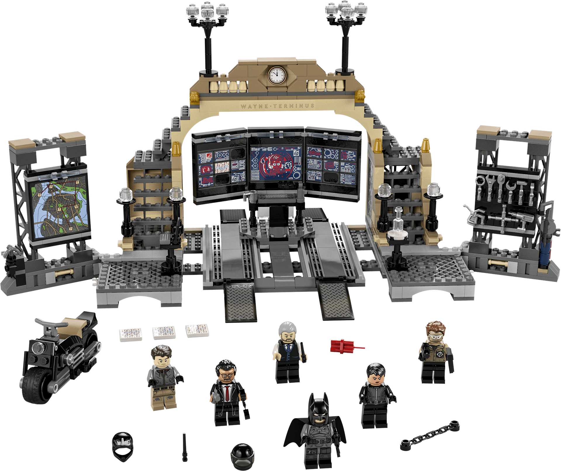 The Batcave is equipped with computers, tools and welding gear for vehicle repairs. The 2 side walls, one with a large GOTHAM CITY™ map and the other with a tool rack, are hinged so they can be rotated into different positions for more play space. The set features 6 minifigures from The Batman movie: Batman, Selina Kyle™, The Riddler, The Drifter, Alfred and Commissioner Gordon. 3 elements containing coded messages from The Riddler can be read only when kids use the special magnifying glass to reveal the clues. When Batman ventures out on his motorcycle, he can disguise himself as his alter ego, The Drifter. And, if he returns with any villains, the Batcave even has its own jail. The playset also allows the Batmobile™ from Batmobile: The Penguin™ Chase (76181, not included) to be driven onto the ramps ready for repairs.