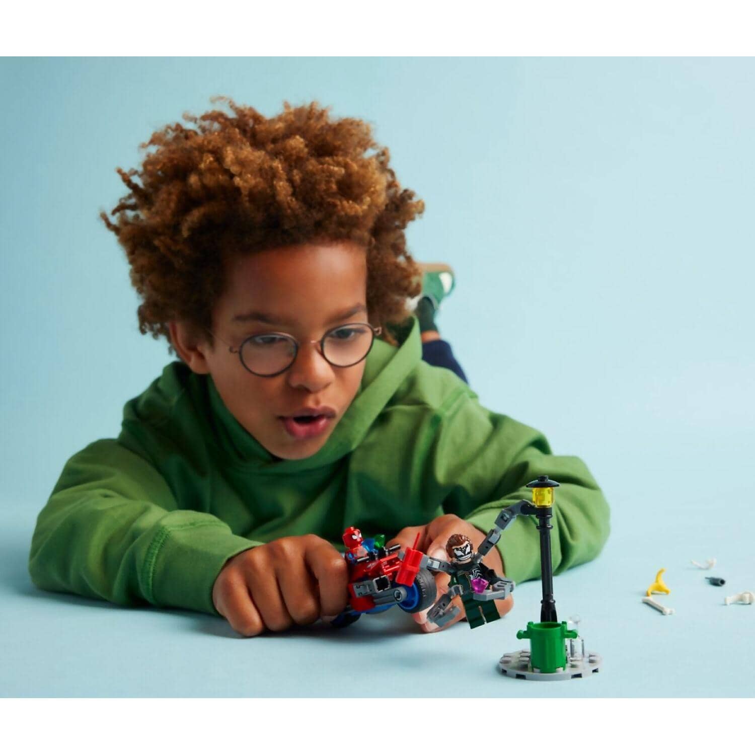 - Easy-to-build kids’ motorcycle – Spider-Man fits onto the driver’s seat of his movable bike, and Doc Ock’s arms can hold onto accessories and the streetlight