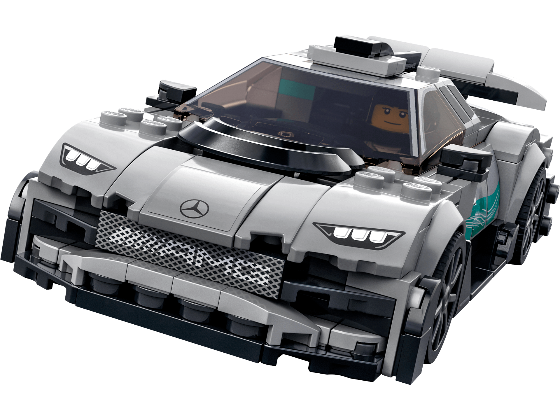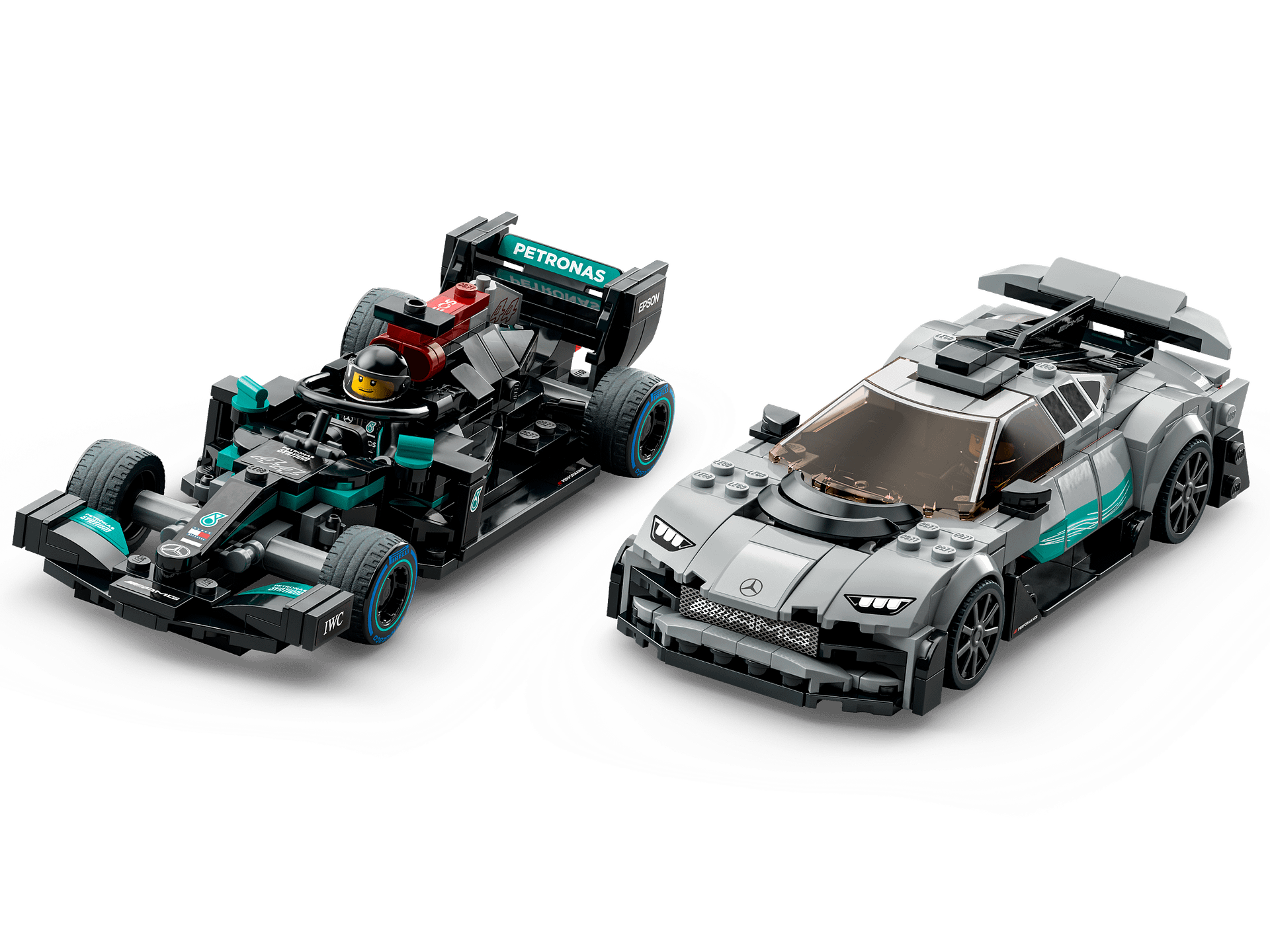 - What’s in the box? – All you need to build a LEGO® recreation of the Mercedes-AMG F1 W12 E Performance and AMG Project One, plus 2 driver minifigures, each with a racing helmet, wig and wrench