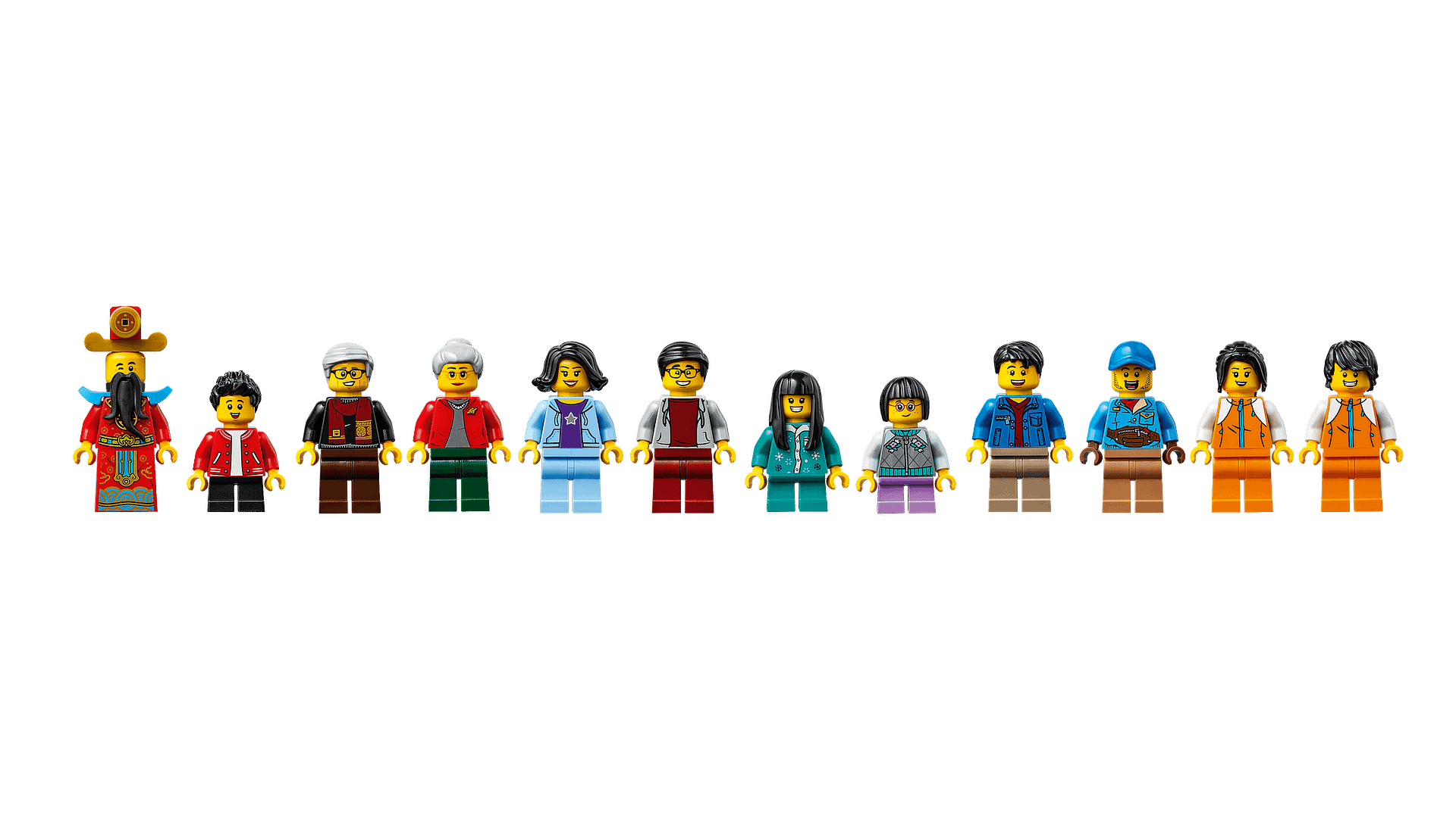 - 12 LEGO® minifigures bring each scene to life – the God of Wealth, a stallholder, a couple, man, girl, and a family of 6: dad, mom, grandpa, grandma, a girl and boy
