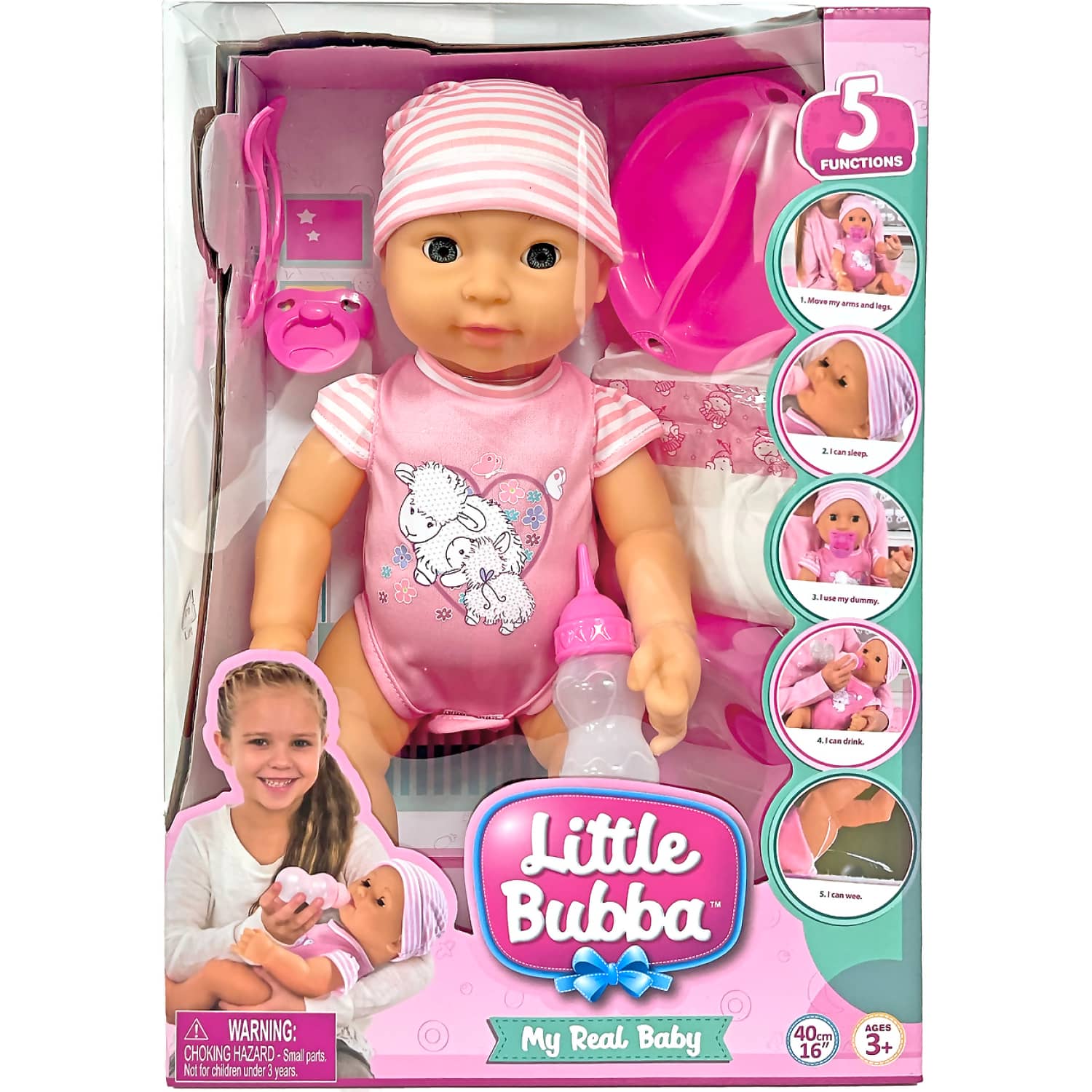 The Little Bubba - My Real Baby is a delightful toy that brings the joy of nurturing to your child’s playtime. This hard-bodied baby doll is designed to mimic the movements and functions of a real baby, enhancing the realism of your child’s pretend play. The doll is 40cm in size and comes dressed in a cute pink romper, adding to its charm and appeal.