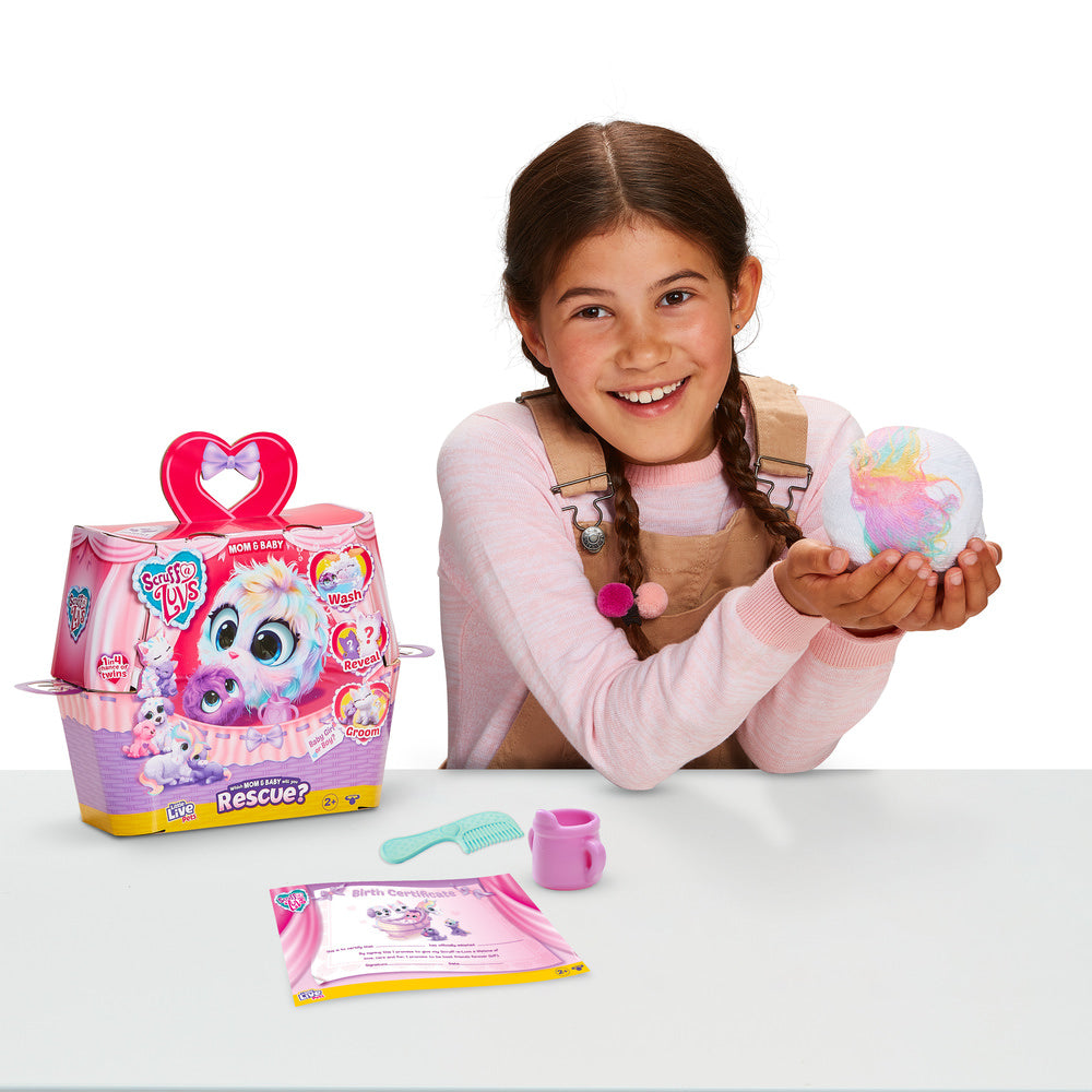 Your Scruff-a-Luv pet arrives as sad ball of matted fur, but once you bathe them to reveal their true pastel rainbow fur color, dry, brush and love them, you will discover what kind of pet they really are!