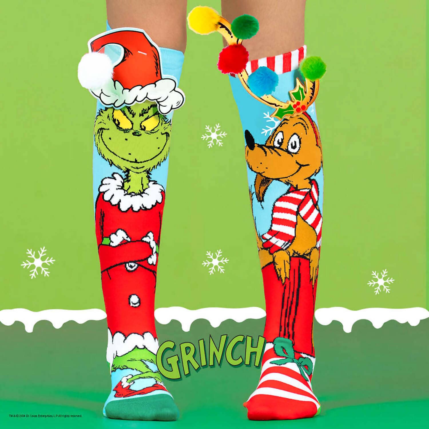 Get festive with MADMIA’s Grinch and Max Socks! Perfect for kids and adults these fun knee-high socks feature the Grinch in a Santa suit with a fluffy pom-pom and Max the dog with colorful antlers.