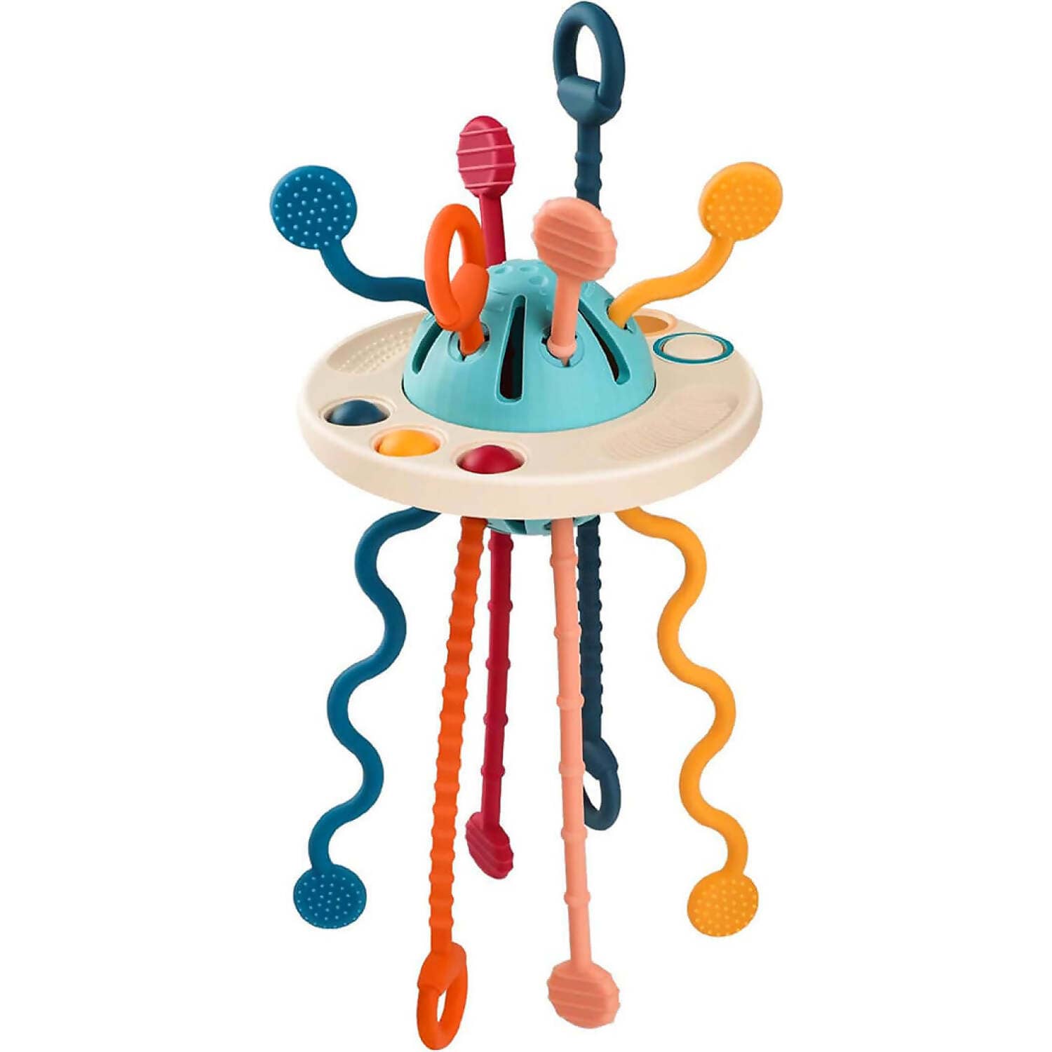 But that's not all; our educational toy boasts bright colors to aid in your baby's vision development, while its flying saucer design makes it easy for little hands to grasp and hold. Pull the cords from one side to the other to hear and feel a variety of sounds and vibrations, further enhancing sensory exploration and fine motor skills.