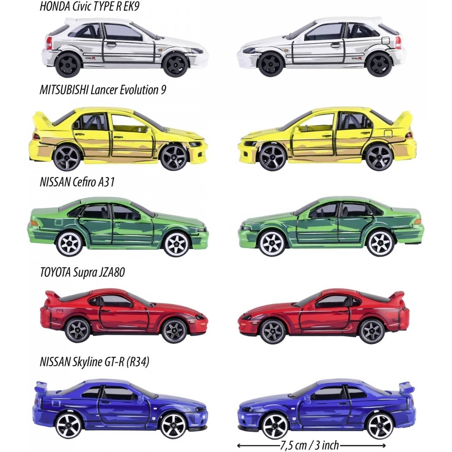 - Set of 5 cars – This gift set includes: 1. Honda Civic TYPE R EK9 (white), 2. Nissan Cefiro A31 (green), 3. Nissan Skyline GT-R (R34) (blue), 4. Toyota Supra JZA80 (red), 5. Mitsubishi Lancer Evolution 9 (yellow).