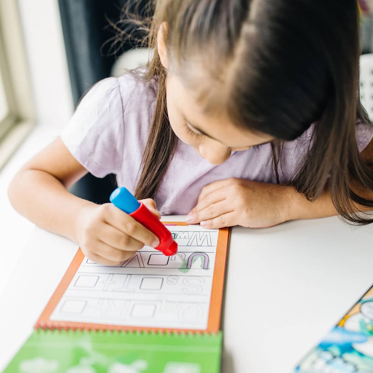 This exciting activity book includes four reusable pages and a refillable water pen. Use the pen to fill in each activity, from coloring in boxes to tracing letters, and see hidden colors and pictures appear with every stroke! Then simply let the page dry to erase the pictures and fill it in again and again. This alphabet-themed book includes every letter of the alphabet (uppercase and lowercase) to trace, alongside pictures of familiar objects to illustrate each sound. There are empty lines for practice, too! The chunky-sized water pen is easy for kids to hold and stores neatly right in the front cover.