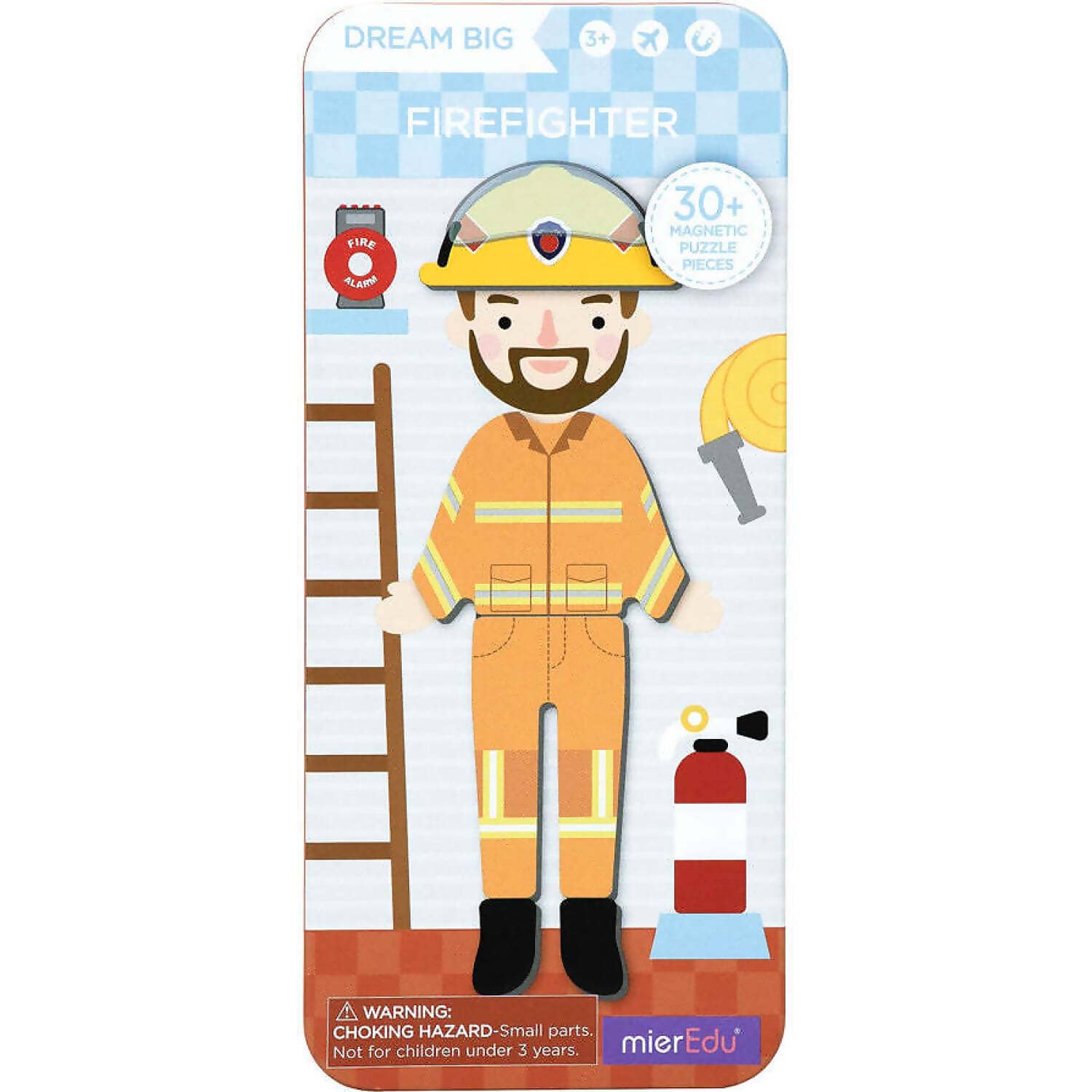 Little Box, Big Dream! This puzzle box encourages children to dream big. Play with more than 30 magnets to build their characters in various outfits and learn about the role of being a Firefighter. All pieces are stored in a handy tin for easy travel. 3+