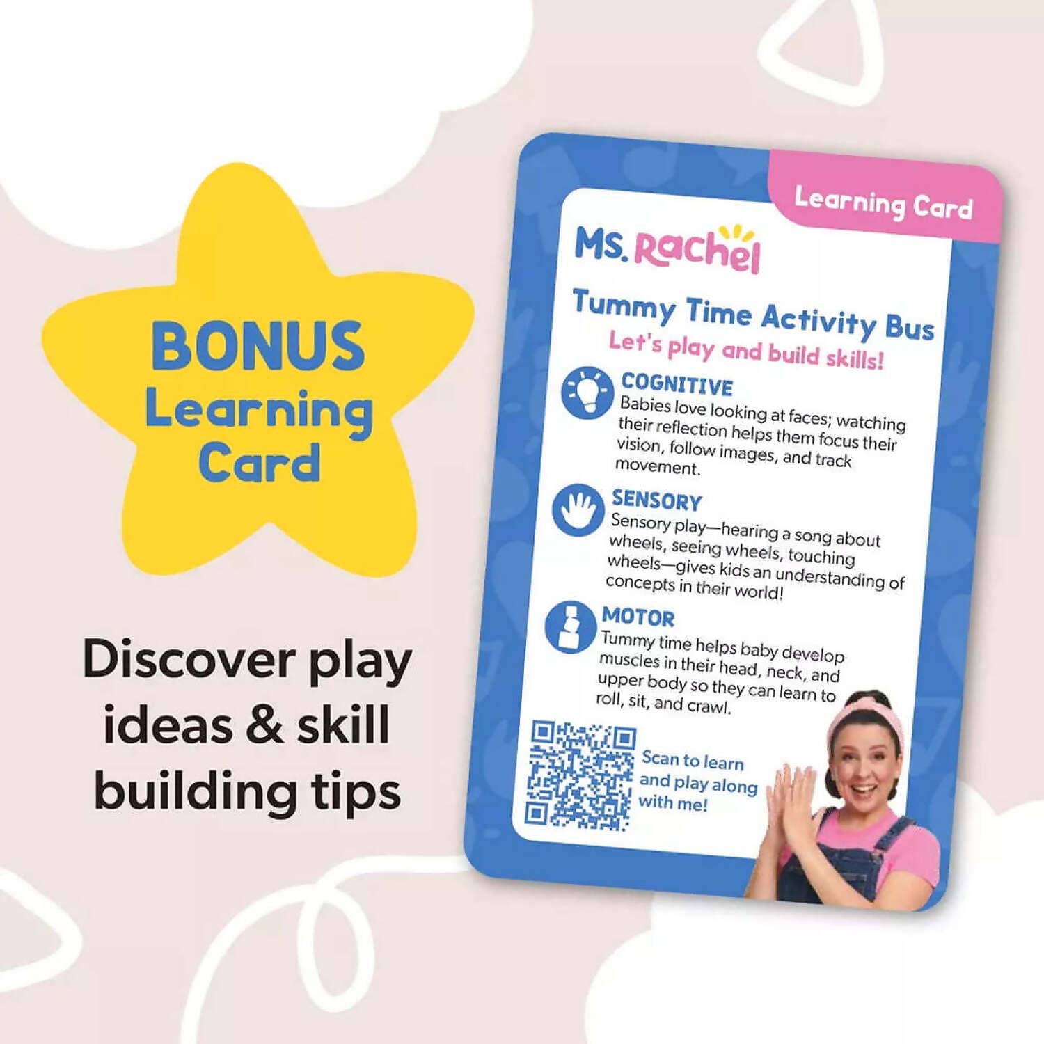 Sing Wheels on the Bus as you and baby explore the Ms. Rachel Tummy Time Activity Bus.