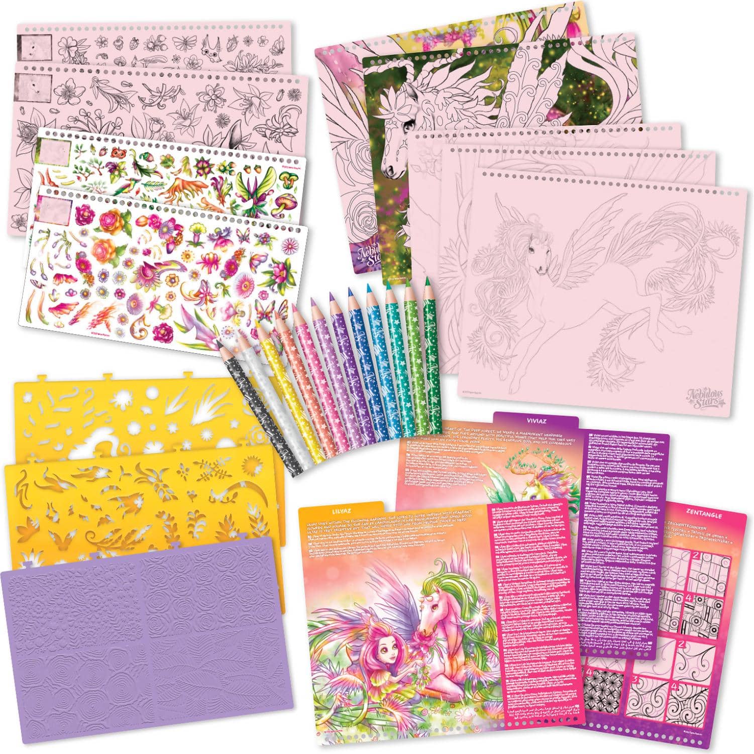 Create mystical and stunning fantasy horses worthy of flying in the magical nebula skies! Use an array of stickers, stencils and techniques to design Petulia and Hazelia's horses.