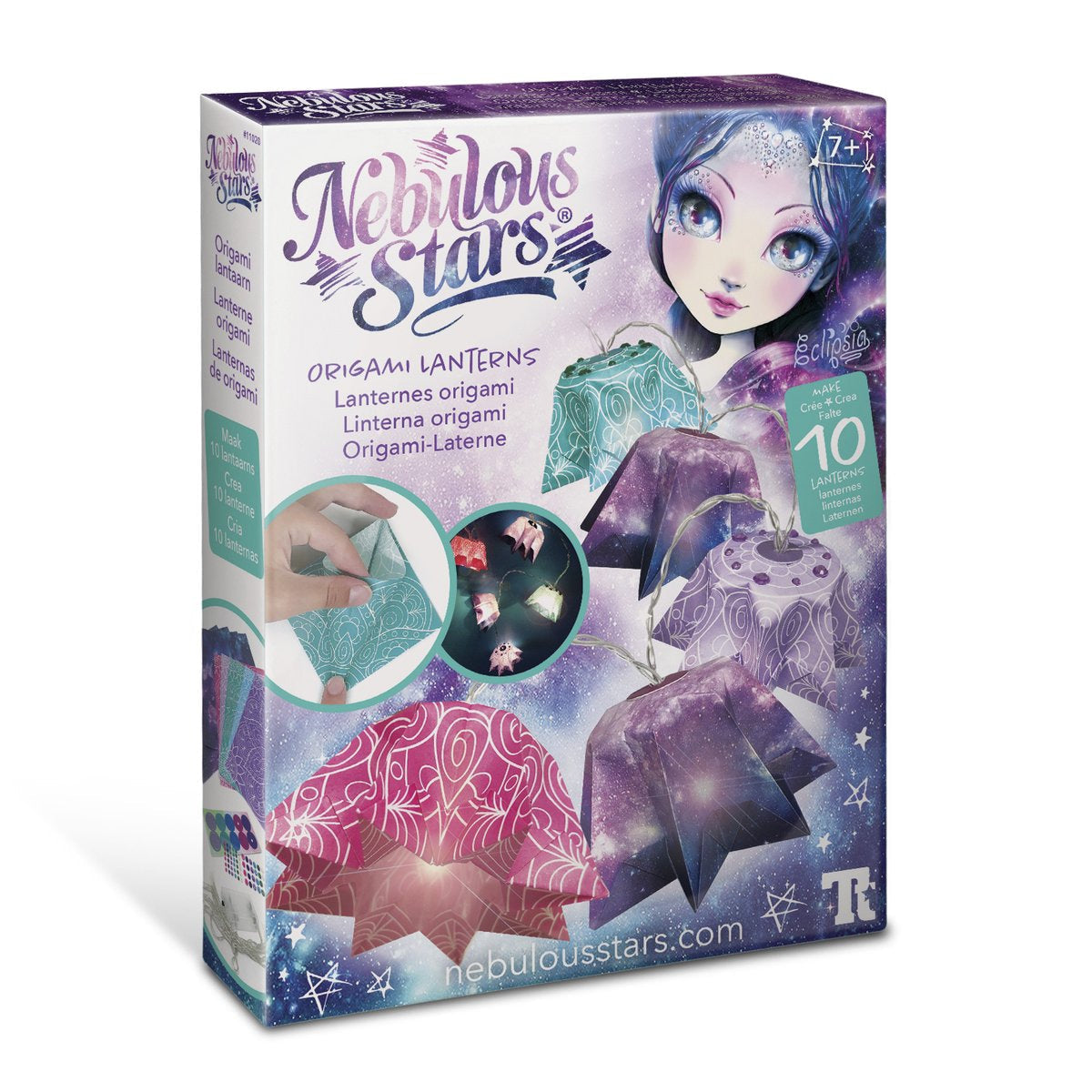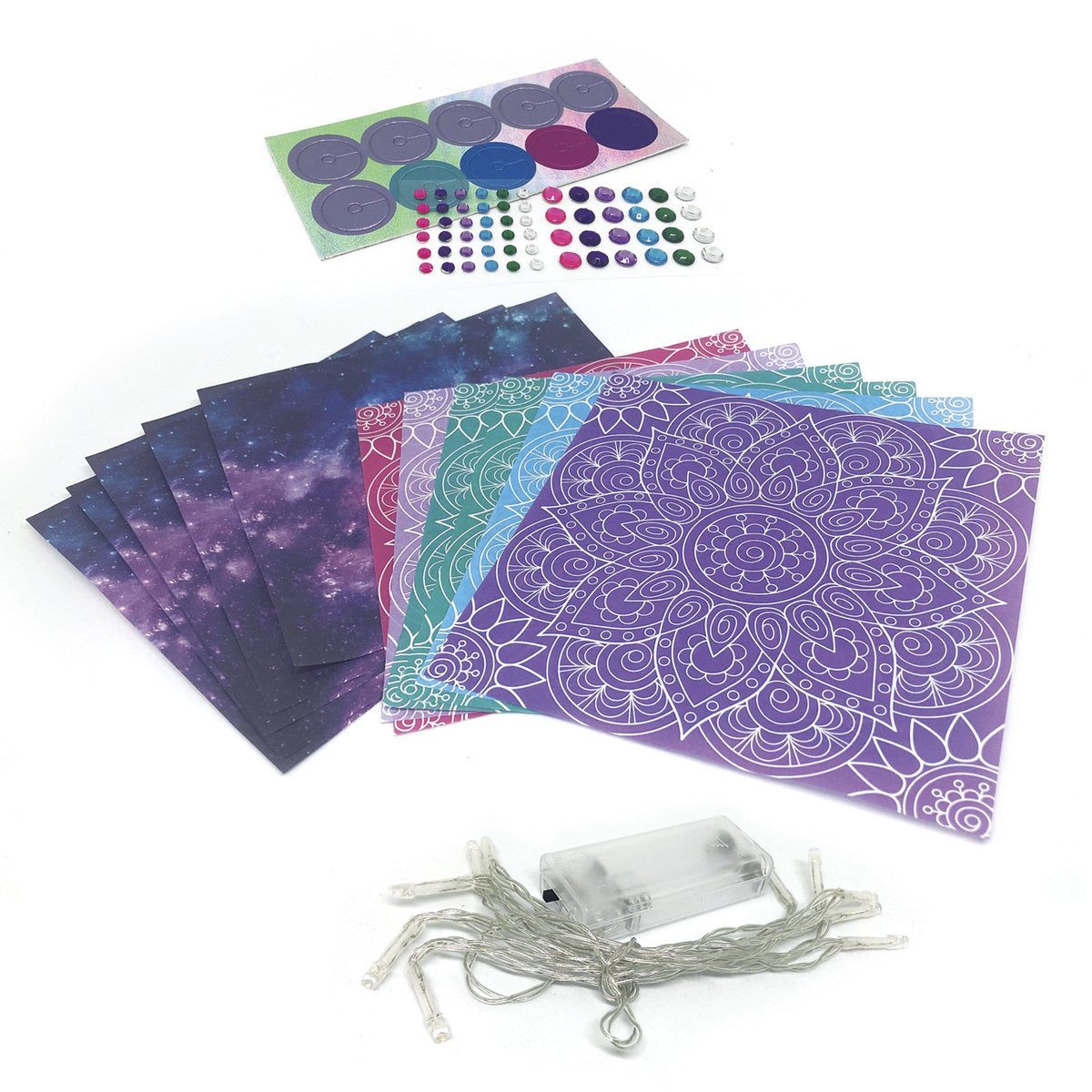 Kit includes Battery-powered LED string lights, 11 printed origami sheets, 10 round stickers and 60 rhinestone stickers.