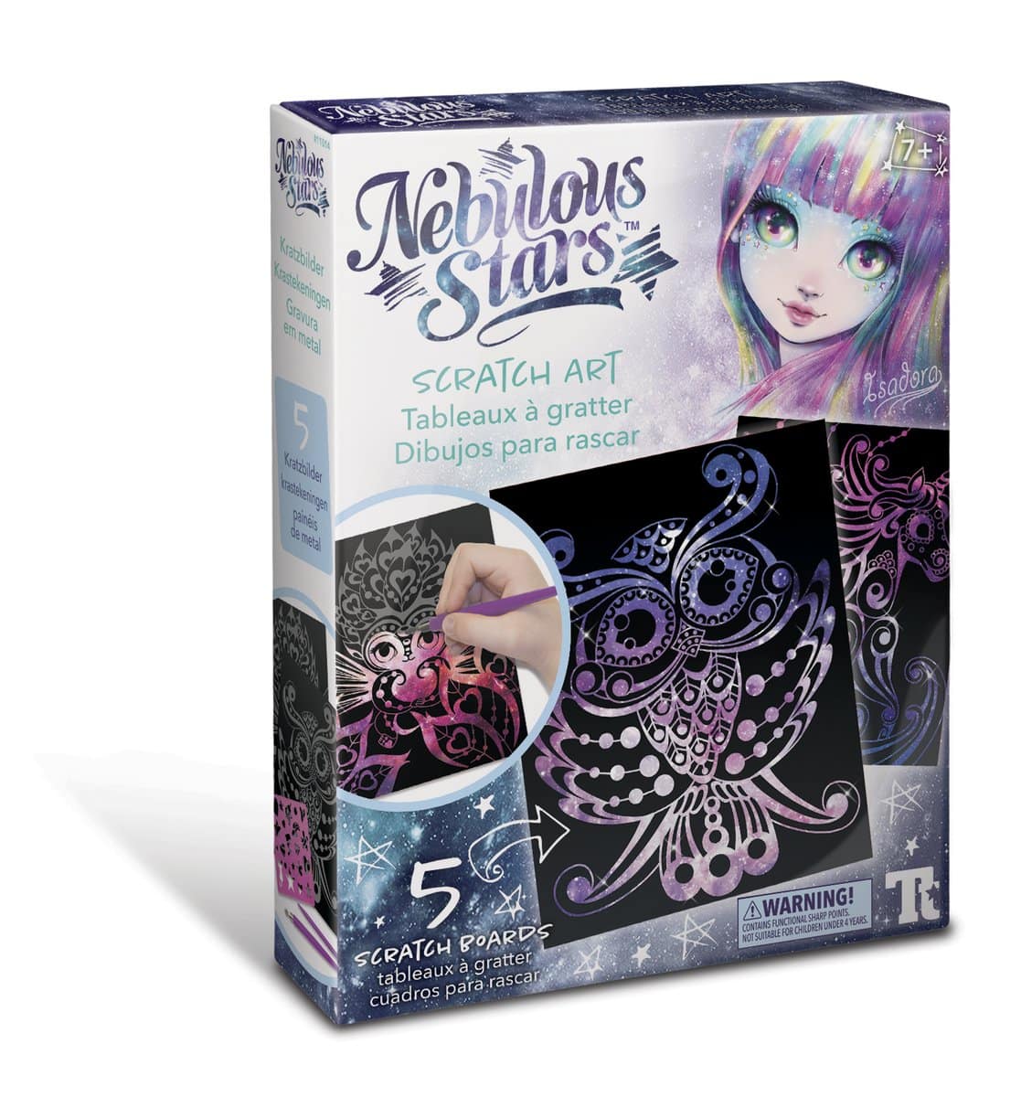 Contents: 5 scratch boards, 2 scratch tools, 21 stencils, colour instructions, Isadora's full story
