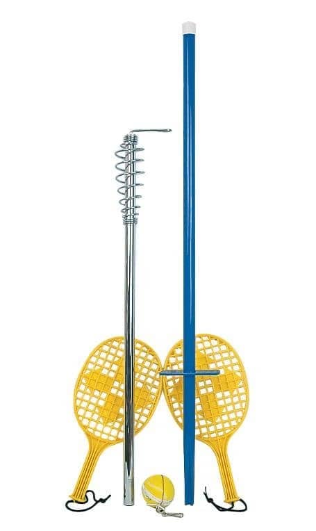 Fast 2 player bat and tethered ball game for the whole family. Orbit Tennis includes in ground powder coated base pole and chrome plated top pole. 2 styles of game play. Swivel rotates freely for fast exciting play. Spring enables scoring and game variation. Complete with 2 strong polypropylene bats with wrist straps and top quality Orbit Tennis Ball with nylon cord and swivel assembly. Supplied in a heavy duty zip-up bag for easy storage.