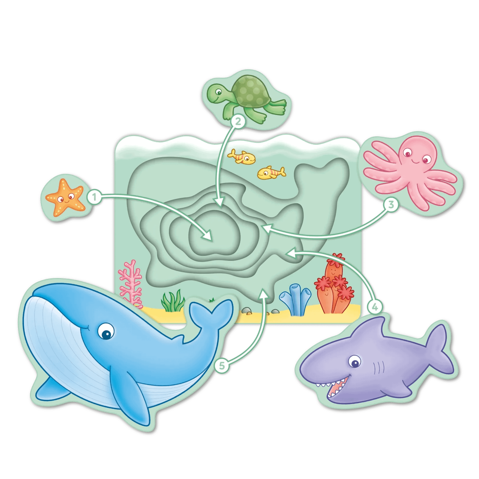- Featuring beautifully illustrated sea creatures, each piece nests within the chunky board in size order
