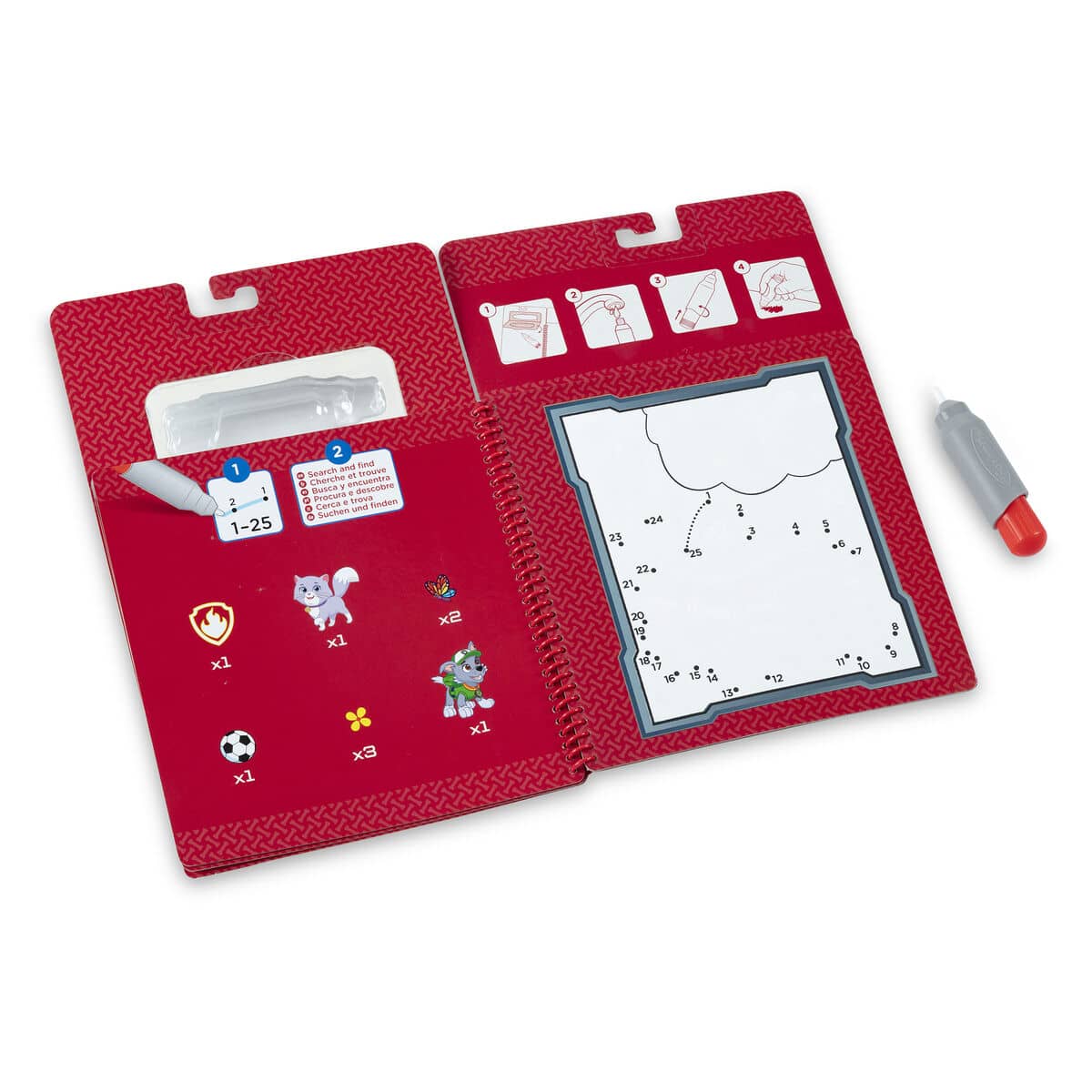 This exciting and reusable activity book features scenes with Marshall and friends from PAW Patrol on four reusable Water Wow! boards! Pages in the spiral-bound book are white when dry, and reveal colors, pictures, and letters when wet. Let the pages dry to erase, then color with water again and again! Search-and-find activities are included with each scene. The chunky-sized water pen is easy to fill, easy for small hands to grasp, and stores in the activity pad - making it a terrific travel toy. PAW Patrol is always ready to help, inspiring preschoolers with a blend of teamwork, adventure, and humor as they develop social, emotional, and developmental skills through play.