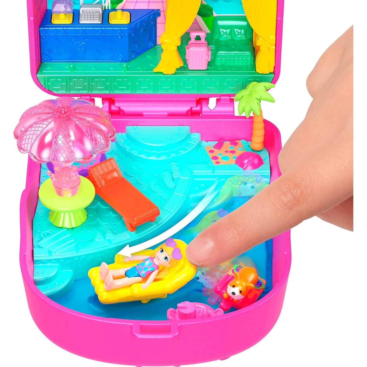 Inside the resort, little ones can lounge under the umbrella, relax on the moving pool float, or serve up smoothies at the snack bar with a working blender mechanism. The foldout bed and detailed décor add layers of play, while the compact design makes it perfect for travel. Designed for fans of pets, holidays, and miniature adventures, this playset offers endless entertainment in a palm-sized package.