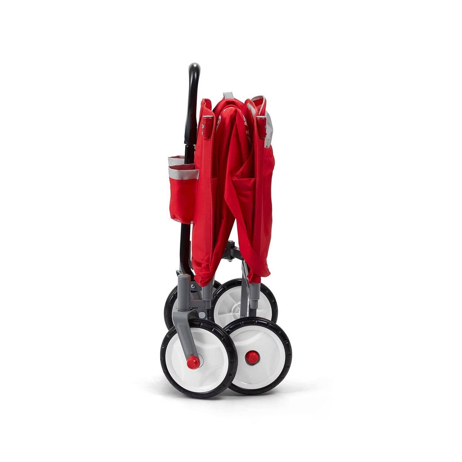 The wagon also features seatbelts for safety, 2 cup holders on the front, and a magnet to hold the handle upright when it is not being used.