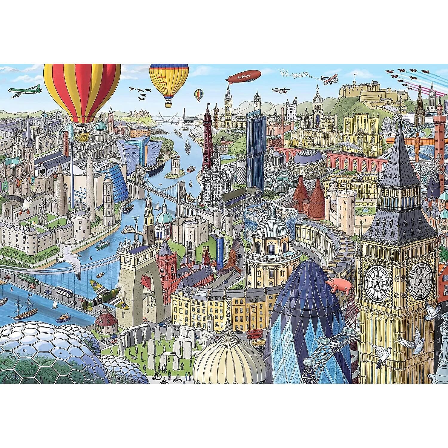 This amazing puzzle depicts places that have existed for 5000 years. In this retro-style picture, we get a bird's-eye view of 86 well-known locations and structures from the UK and Ireland. There is a lot to learn about and enjoy, from historic locations like Stonehenge and the Rock of Cashel to architectural marvels like Portmeirion's Bell Tower and Oxford's Radcliffe Camera to more modern buildings like Titanic Belfast and the Falkirk Wheel.