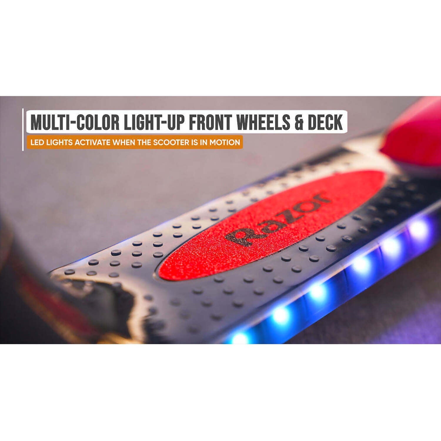 - Multi-Color Light-Up Front Wheels & Deck – The multi-color LED lights in the front wheels and the deck will illuminate when the scooter is in motion