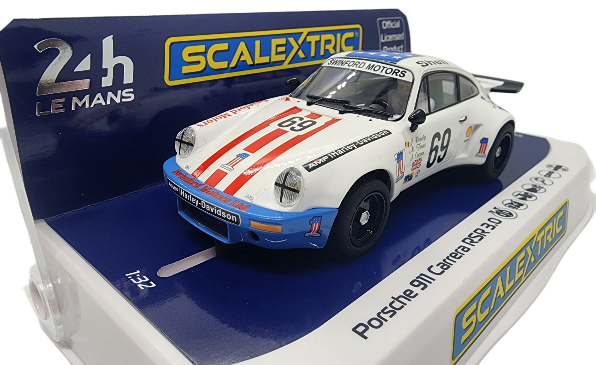 The 1975 LeMans 24-hour race saw this wonderful Porsche 911 3.0 RSR finish a credible 6th overall and 2nd in the GT class, closely behind another Porsche 911 3.0 RSR. Crewed by Belgians Nick Faure and Jean Beurlys as well as the Englishman John Cooper the Porsche was a consistent contender amongst some more fancied cars in the class, its reliability and pace allowing the nimble 911 RSR to outperform the bigger, quicker Ferrari Daytona™s it was facing. This car comes in a great USA themed livery, with sponsor Harley Davidson featuring prominently, and is a great addition to any classic GT grid. Technical Specifications: Item Length Without Packaging (cm) - 12 Item Height Without Packaging (cm) - 8 Item Width Without Packaging (cm) - 6 Item Scale - 1:32 Scale Digital Plug Installed - No Compatible with ARC PRO/Digital - Digital chip required Compatible with Spark Plug - Yes