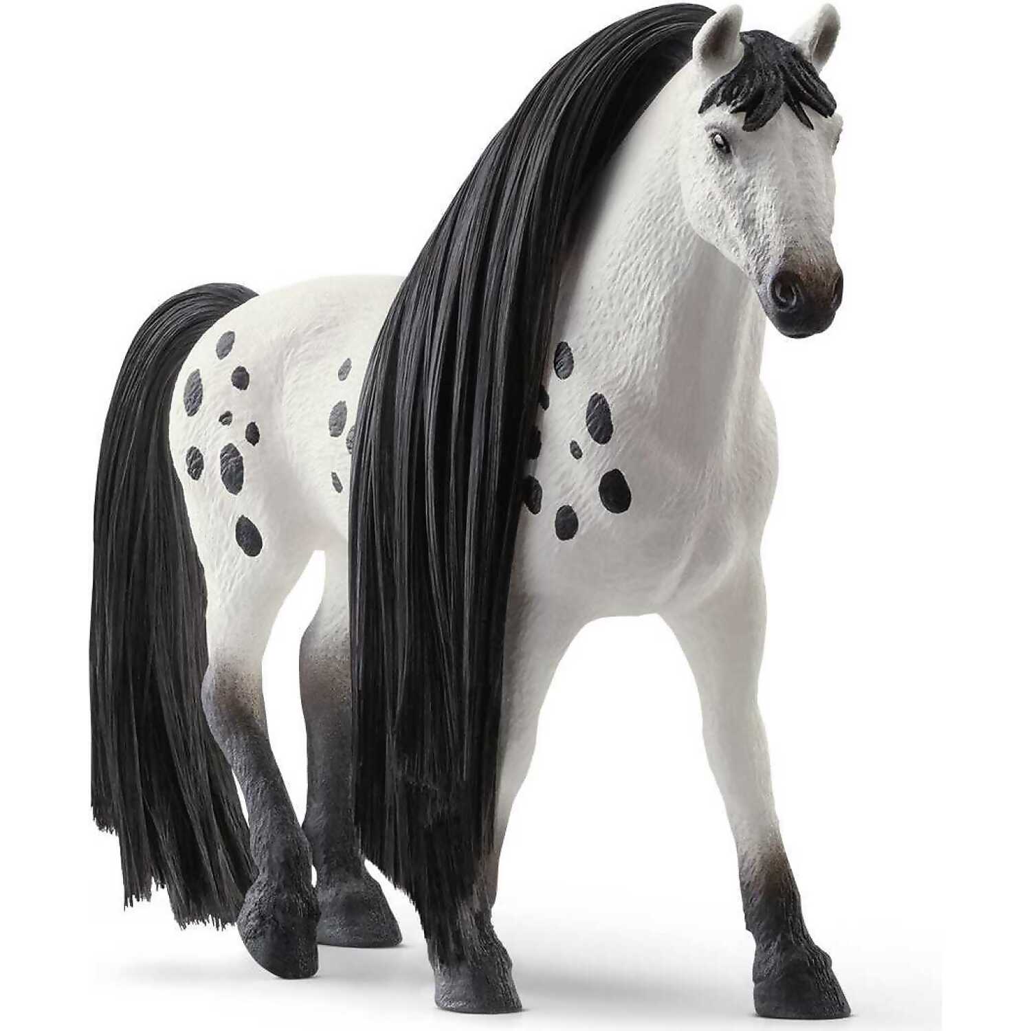 The Beauty Horse Knabstrupper stallion is a real beauty! His magnificent mane can be decorated with different clips. The hair is long enough to be braided into dreamy hairstyles especially after a grooming session with the finger comb. And if you fancy a change of hair color: You can simply switch out the mane with replacement manes from the schleich® range!