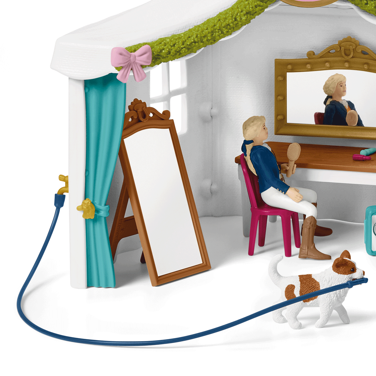 Contents include 2 x girls, 1 x Tennessee walking horse, 1 x Lusitano, 1 x puppy, 1 x show arena, 2 x spotlights, 3 x scoreboards, 1 x tent with sign and curtains, 1 x hanging mirror, 1 x standing mirror, 1 x brush, 1 x lipstick, 1 x make-up brush, 1 x make-up compact, 1 x make-up kit, 1 x jury table, 2 x spiralling vines, 7 x curved vines, 8 x straight bows, 4 x corner bows, 2 x bo x tree ribbons, 6 x decorative flowers, 6 x decorative hearts, 6 x decorations, 6 x decorative roses, 6 x decorative bows, 6 x decorative horse heads, 1 x bridle, 1 x lead rope, 1 x harness, 4 x spats, 2 x paddock gates with bolts, 3 x paddocks, 1 x bucket, 1 x apple, 2 x flags, 2 x bo x tree planters, 1 x table, 1 x grooming box, 1 x hay rack, 1 x purple rosette, 1 x turquoise rosette, 1 x pink rosette, 1 x chair, 1 x hoof pick, 1 x brush, 1 x hose, 1 x tap, 1 x trophy, 1 x curry comb, 1 x skirt, 1 x horse blanket, 1 x felt carpet, 1 x scoreboard barrow, 1 x sticker sheet, 1 x assembly instructions