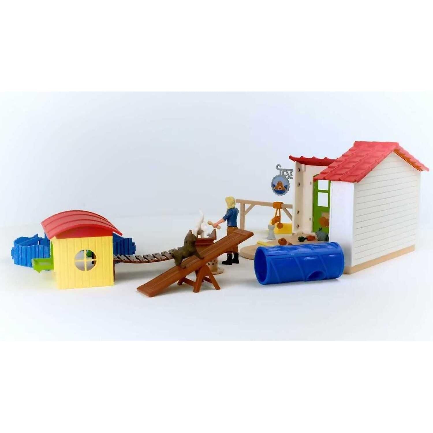 1x animal hotel, 1x animal keeper, 1x baby goat, 2x kittens, 1x golden retriever puppy, 1x German shorthair puppy, 1x hamster, 1x rabbit, 1x guinea pig, 1x wooden platform, 1x little house blue, 1x little house yellow, 1x little house red, 1x cat scratching post, 1x animal swing, 1x mini stable building, 1x crawl tunnel, 1x seesaw large, 1x suspension bridge with platform, 1x slide, 5x fences, 1x dog basket, 1x seesaw small, 1x mobile, 2x bowl, 1x carrots, 1x salad, 1x bone, 1x sticker sheet. Swallowable small parts.
