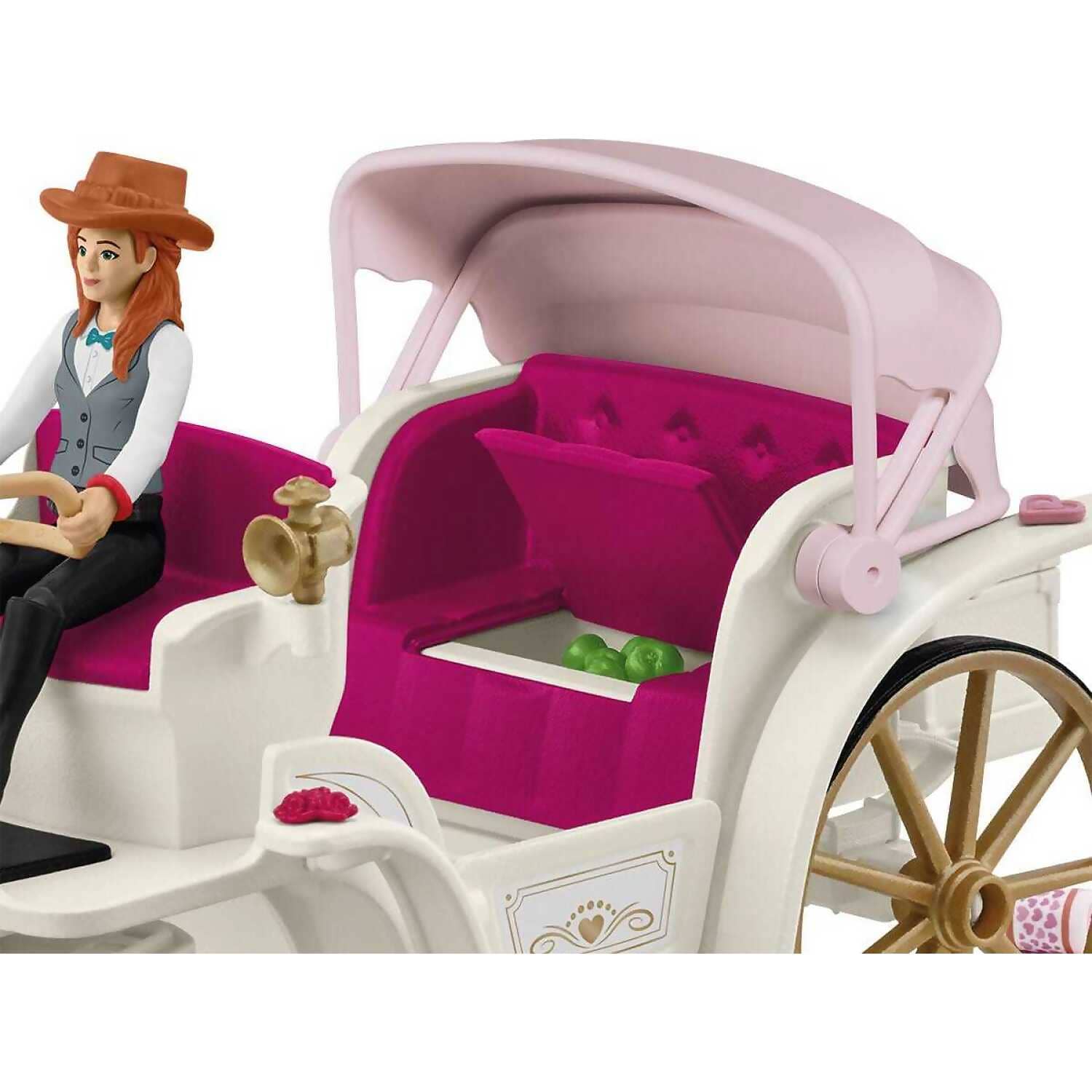 Content: 1x Lipizzaner, 1x bride Emily, 1x groom Toby, 1x carriage, 5x cans, 1 string, 1x chest, 1x bottle, 1x camera, 1x bridle, 1x girth strap, 1x dress, 1x veil, 1x waistcoat, 3x horse decorations, 2x gaiters, 1x apples, 1x bunch of flowers, 2x boxwood shrub, 1x boxwood arch, 1x sign, 2x doves, 1x cushion, 1x rug