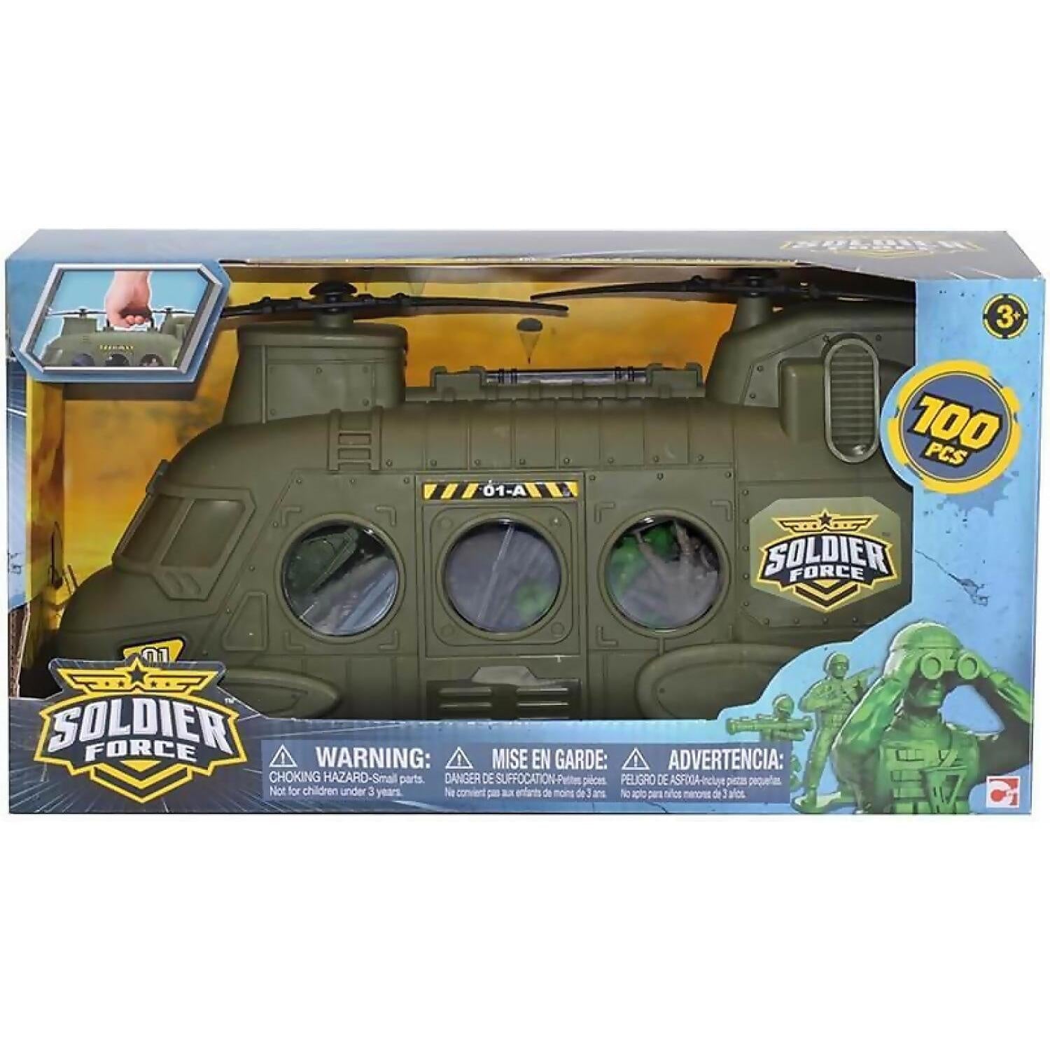Product Description: The Soldier Force - 100pc Chinnok Playset is the ultimate battle bucket for the ultimate commanding officer: YOU! This playset allows you to lead your Soldier Force Mission Troops to victory with a massive selection of soldier figures, accessory pieces, a jet, tank and chopper. All pieces fit inside the big chinook bucket, making it easy to carry and store.