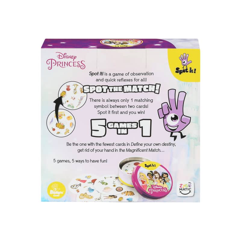 Now children can spot their favorite Disney Princesses in this new release of this special Disney Princess edition of the classic 'Spot It' game! This fast-paced fun family game of observation and quick reflexes for is ideal for players aged 4 and up. Be the first to spot the only matching Princess between two cards to win! Every card in the deck has a match, you just have to 'Spot It'!