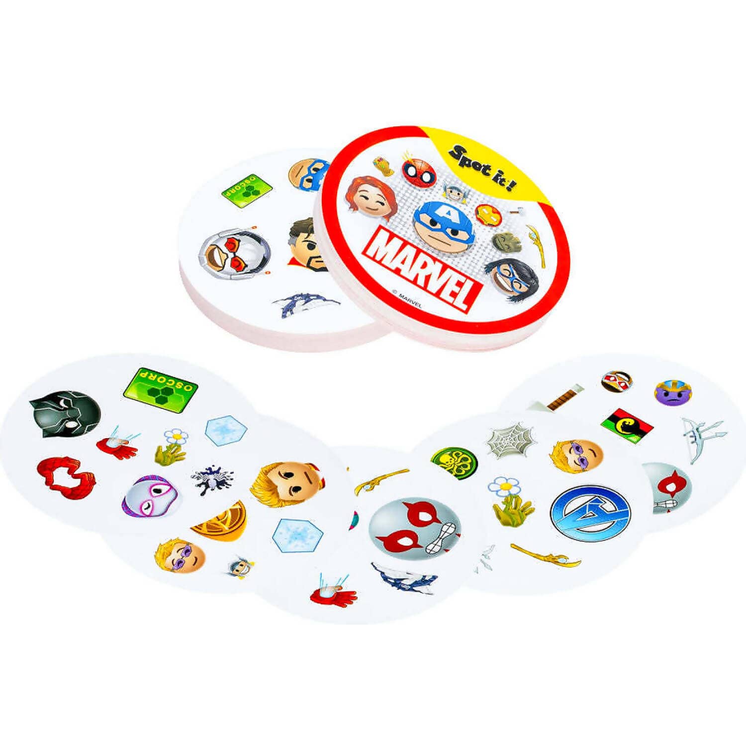 Be the first to spot the only matching Marvel character symbols between two cards to win! Every card in the deck has a match, you just have to 'Spot It'! Spot some of your favorite Marvel Characters like Iron Man, Captain America, Cosmic Cube and more. Everyone can play this Marvel edition of 'Spot It' anywhere. Its compact size means you can take it with you.
