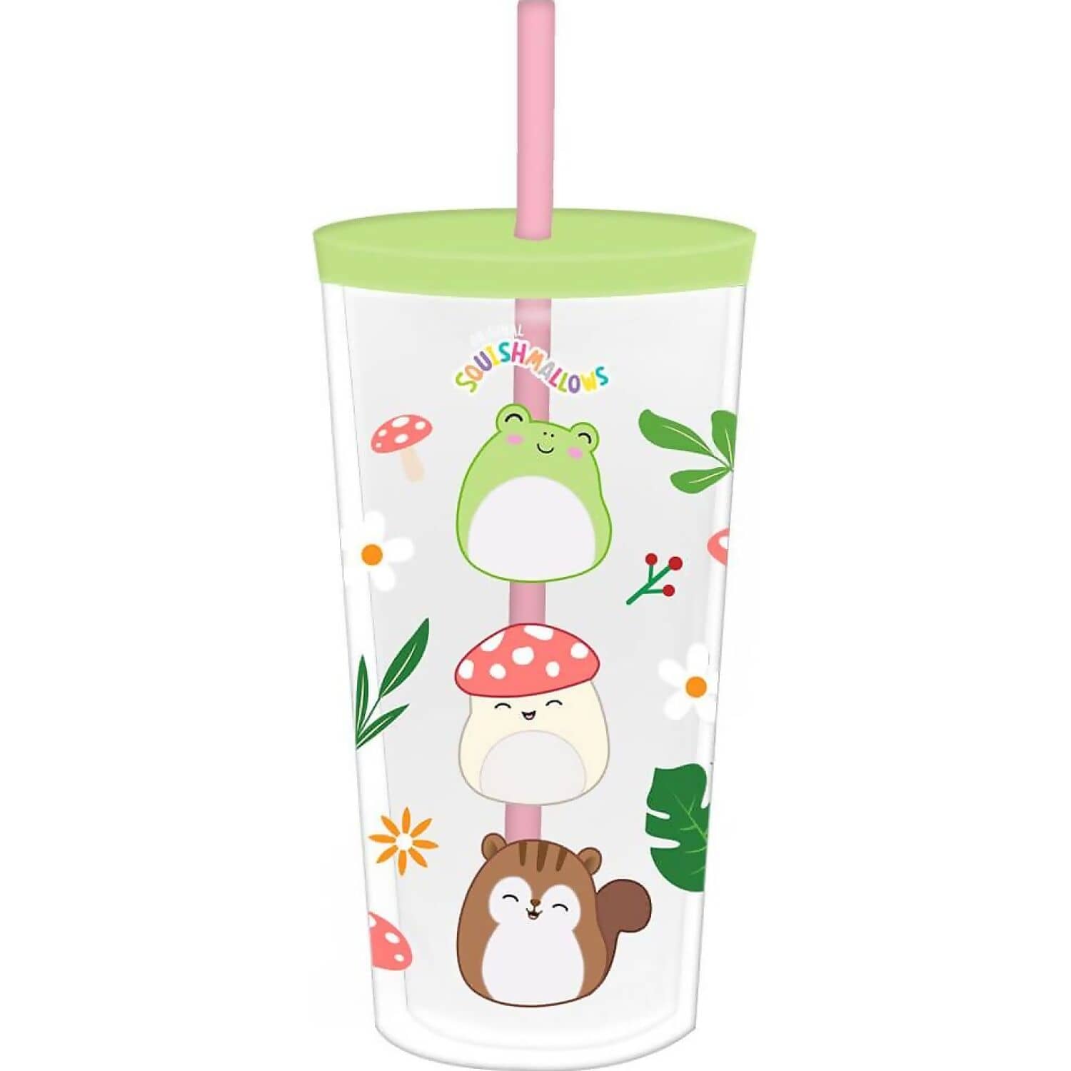 This clear Beaker design features three popular Squishmallows characters Wendy Frog, Malcolm Mushroom and Sawyer Squirrel. Pink straw included. Holds 600ml