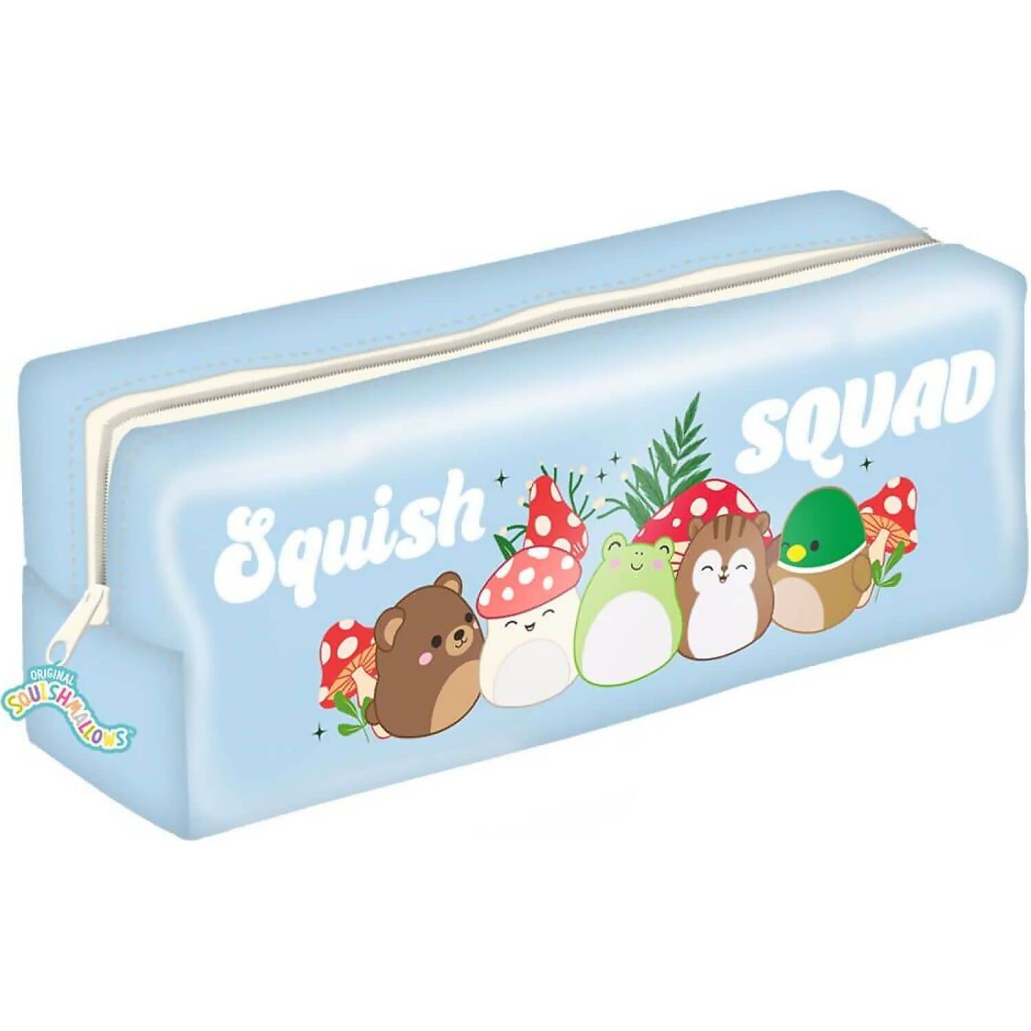 Take the Squish Squad with you to school with this pencil case featuring popular Squishmallows characters on either side surrounded by toadstools. Caption reads 'Squish Squad'.