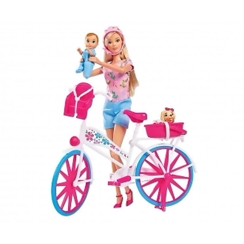 Steffi is well equipped for cycle touring. Her trendy bike has space for her baby in a baby seat and her dog in a doggy basket. She wears a helmet to keep her safe on her little jaunt. Suitable for children aged 3 and over.