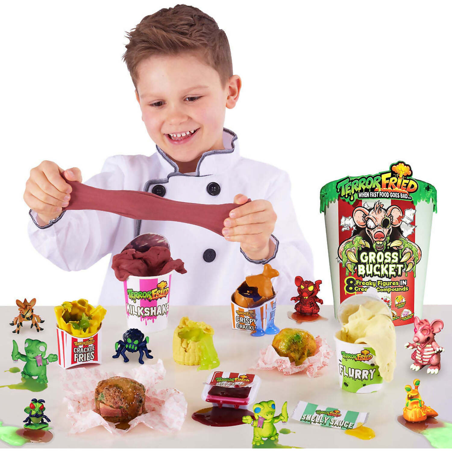 Welcome to Terror Fried… The nastiest, gnarliest, creepy critters and crusty crawlers from deep inside the fast food fryer. Get more than you bargined for with the Terror Fried Gross Bucket! With a huge 8 freaky figures to find in a variety of creepy compounds. The Gross Bucket allows you to fizz, squish, crack and ooze as you play through multiple layers of discovery and jump scare reveals.