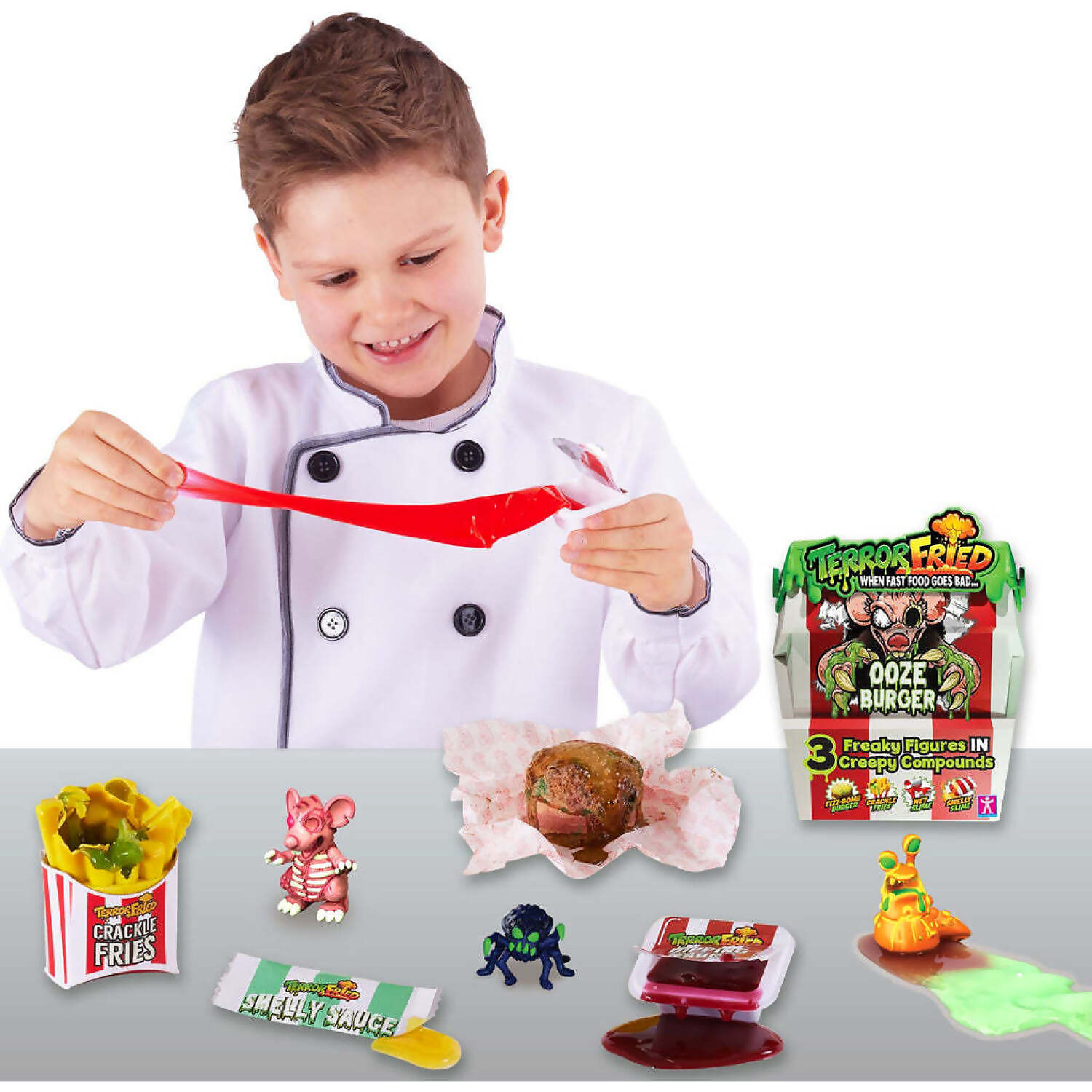 Welcome to Terror Fried… The nastiest, gnarliest, creepy critters and crusty crawlers from deep inside the fast food fryer. The Ooze Burger includes a variety of ways to reveal your surprise character. Crackle Slime, Jelly Slime and Fizz Bomb - which food will be in your meal?