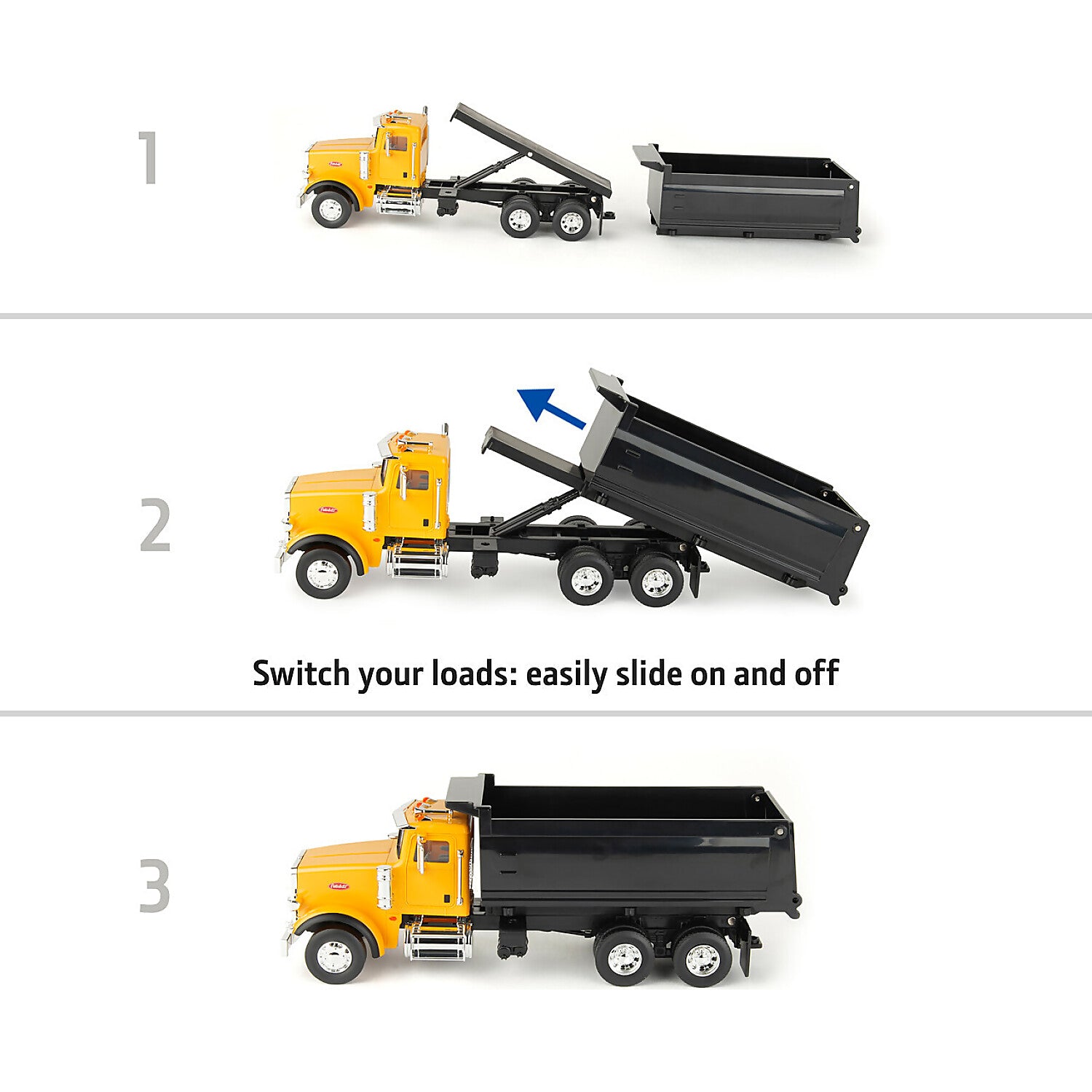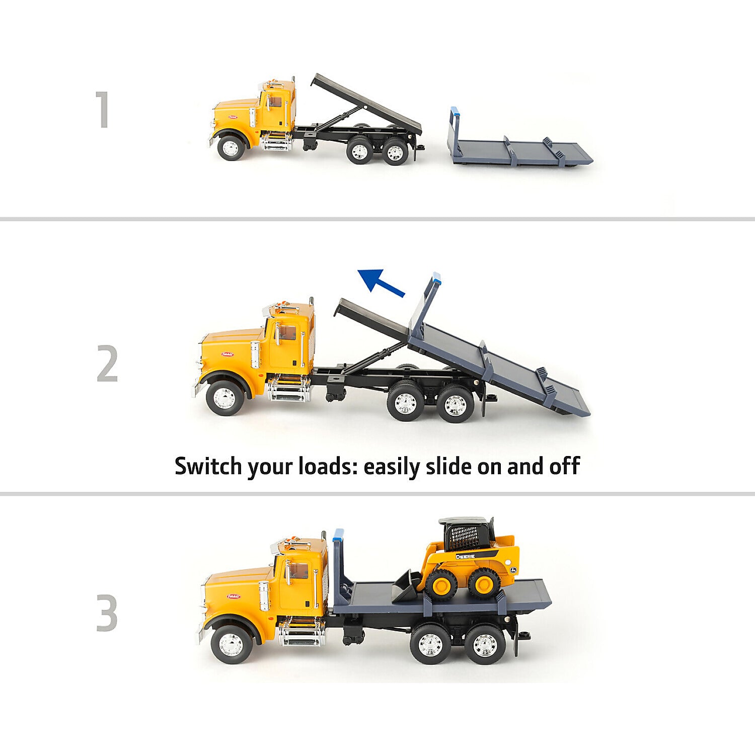 Switch it up for two fun ways to play! This Switch 'N Load Construction Playset gives kids a unique way to imagine themselves getting the job done. Depending on the task at hand, they'll need the proper load to get it done right. Switch the load on the Peterbilt semi to a flatbed to haul the included John Deere skid steer.