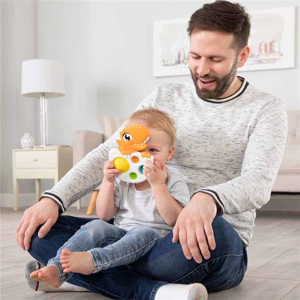 - Designed to encourage developmental play, little hands can’t resist exploring each silicone bubble on this cute dino.