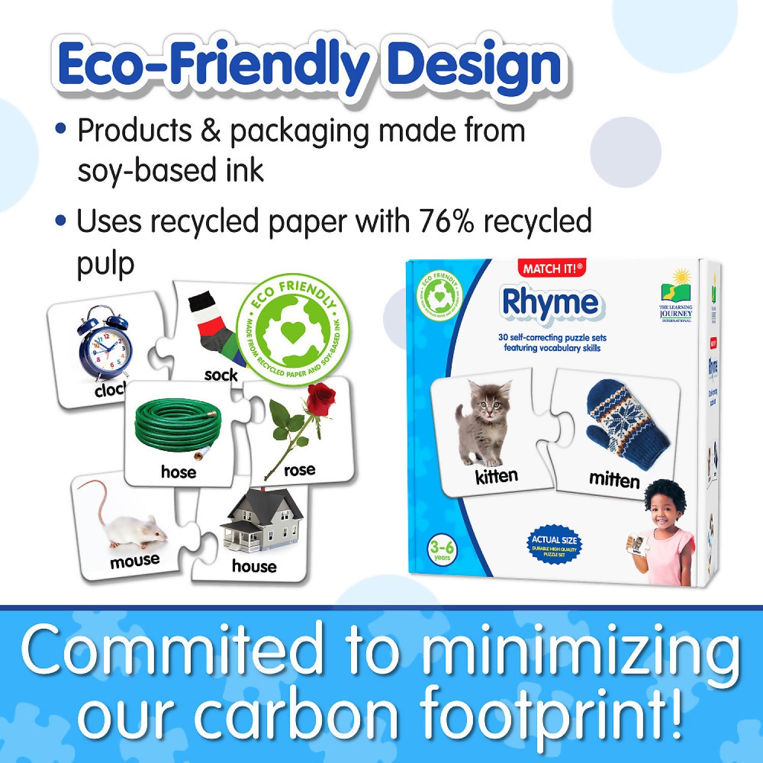 The brightly illustrated puzzle cards engage children in the learning process in an entertaining way. Match It Rhyme includes 30 self-correcting puzzle pairs.